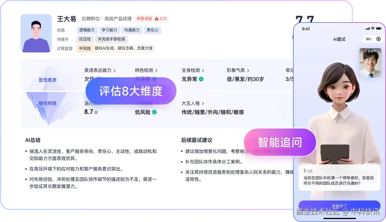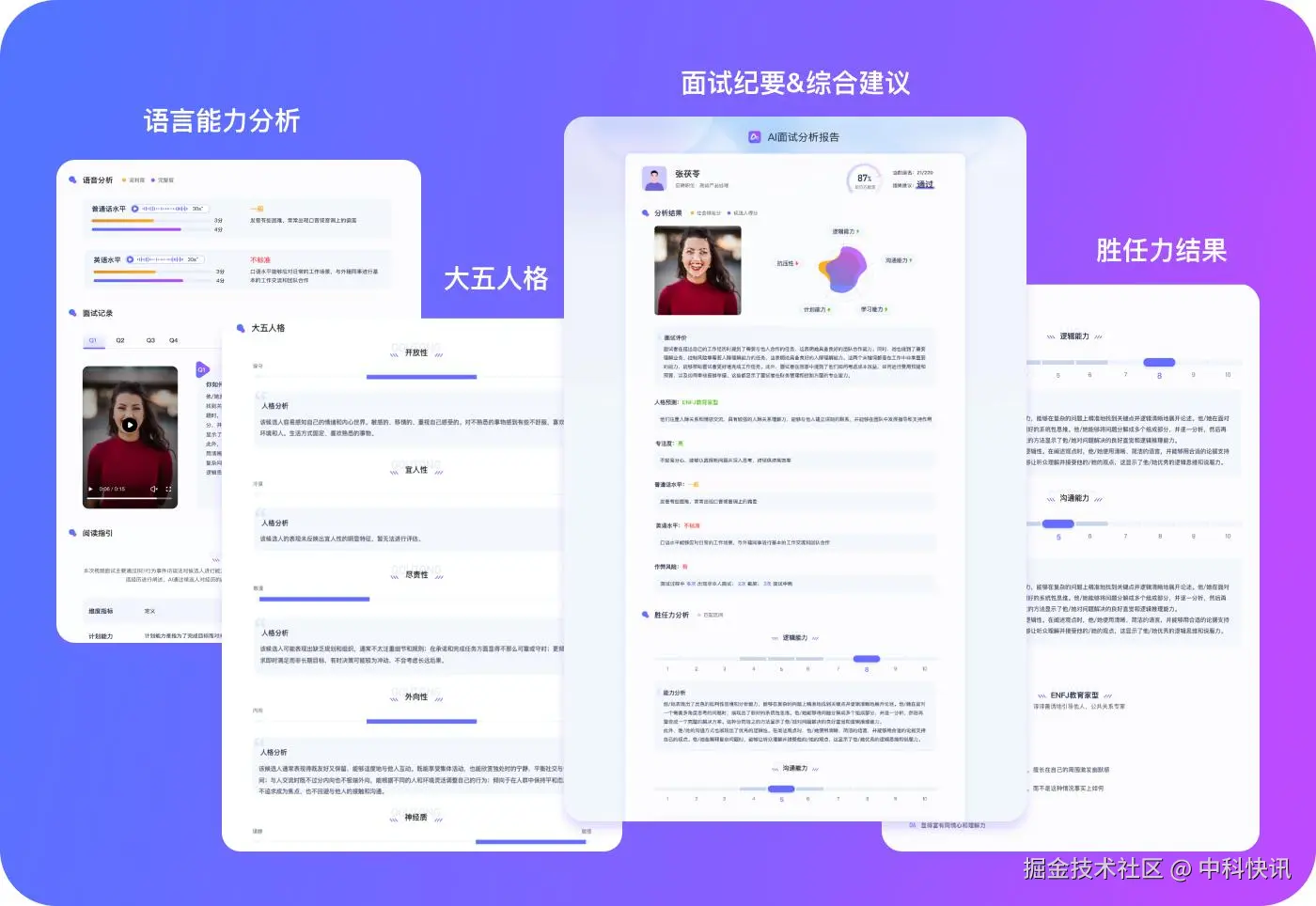 - 多模态分析:同步分析语音语调、微表情、语义逻辑,识别"犹豫次数""语速波动"等数百项指标,评估维度涵盖胜任力、性格特质、心理风险等八大维度