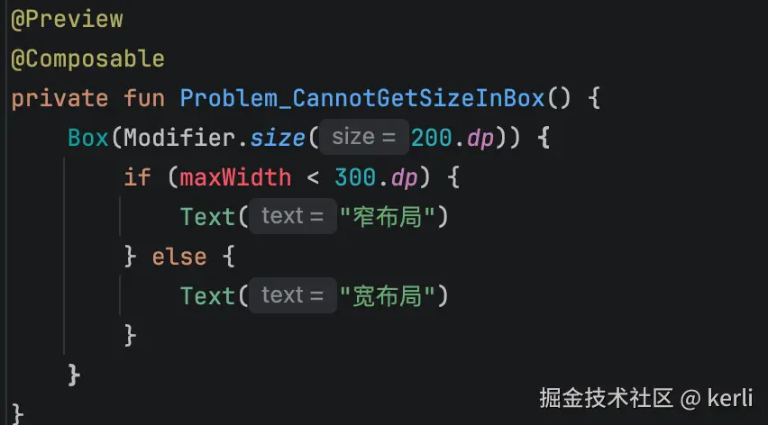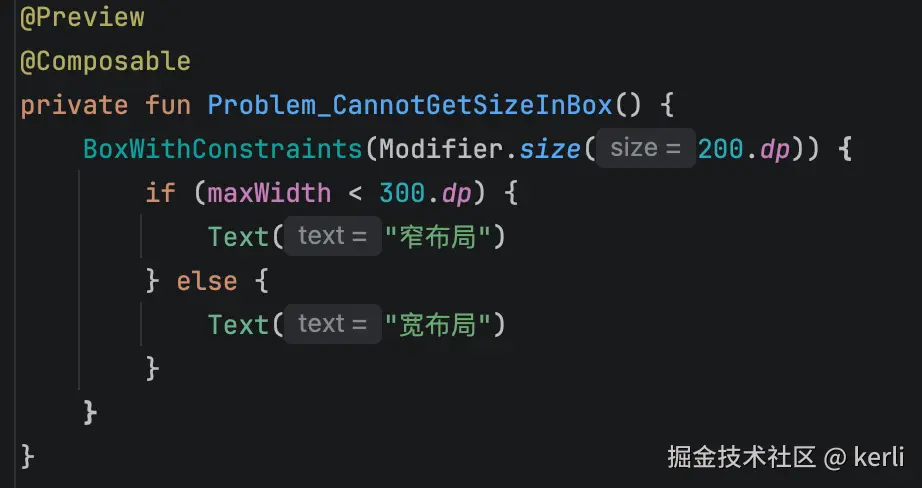 这是因为,Box 的 content lambda 在组合阶段执行,而尺寸信息要等布局阶段才能确定。组合在前,布局在后——所以在 Box 的 content 里,尺寸信息根本还不存在。