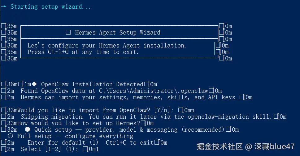 依赖环境安装完成后,系统会自动进入 Hermes Agent 的终端配置向导。强烈建议新手直接通过键盘上下键选择第一项 Quick setup (快速设置) 。
