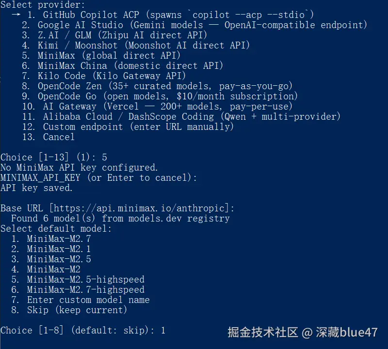 接下来需要绑定驱动 Agent 的大语言模型。请根据您自己拥有的 API Key 选择对应的模型供应商。本文为了演示,以国内优秀的 Minimax 模型为例进行配置。