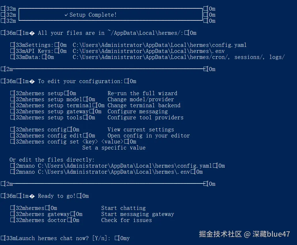 当您在终端中看到标志性的欢迎界面时,恭喜您,Hermes Agent 的主体安装已经成功!