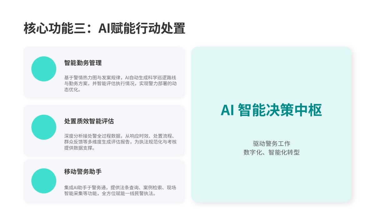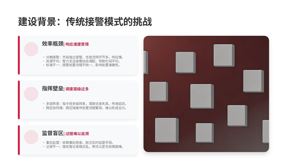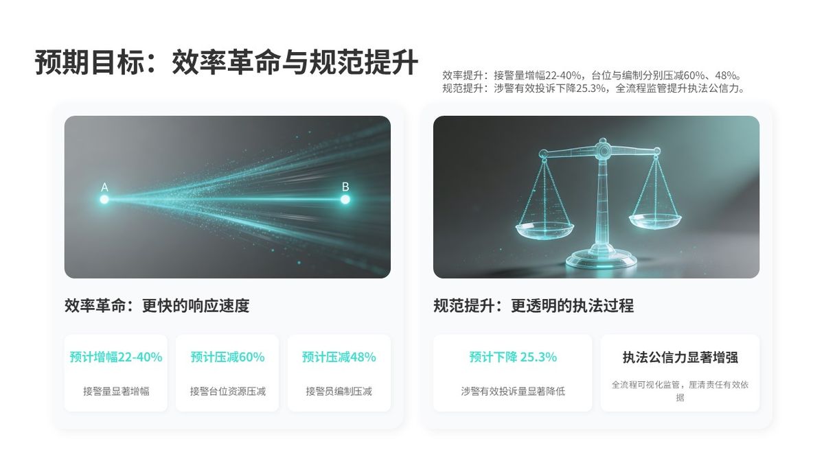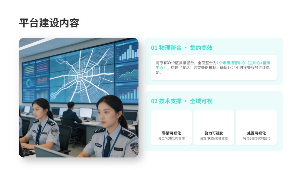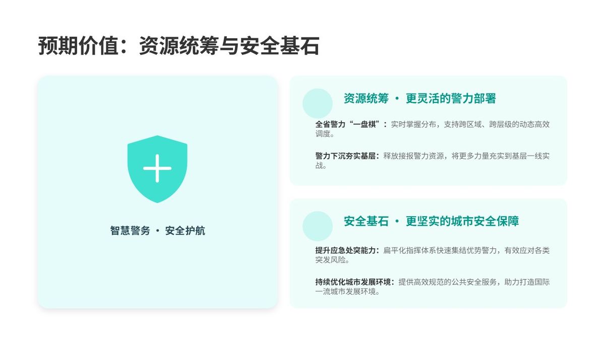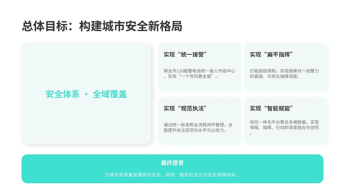 目标:统一全市接警、派警、处警、实现1分钟派警、一键式调度,提升跨区域协同与重大警情响应效率。