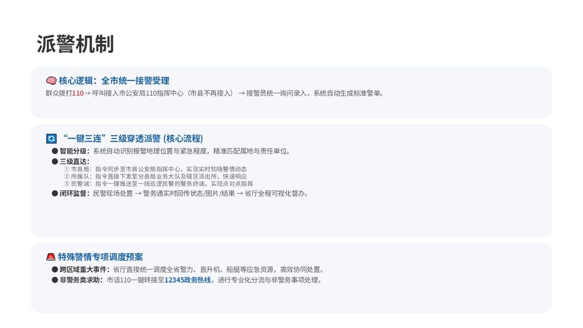 (一)接警:全省统一受理群众拨打 110 → 呼叫统一接入市局公安局 110 接警中心(不再接入市县)→ 市局接警员统一询问、录入、自动生成标准警单。