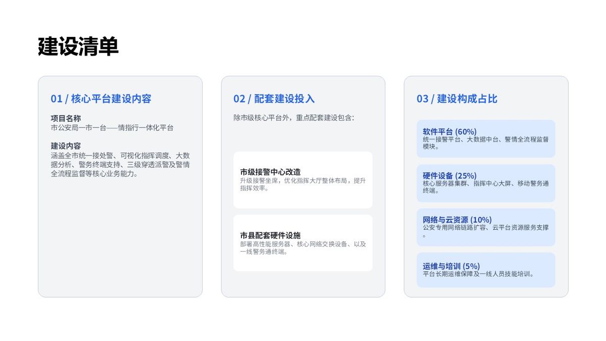 云平台升级(网络 / 安全 / 计算存储 / 软件授权);110 语音排队调度设备(含通信控制、音视频录制)