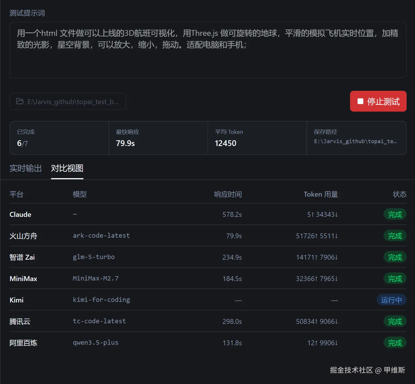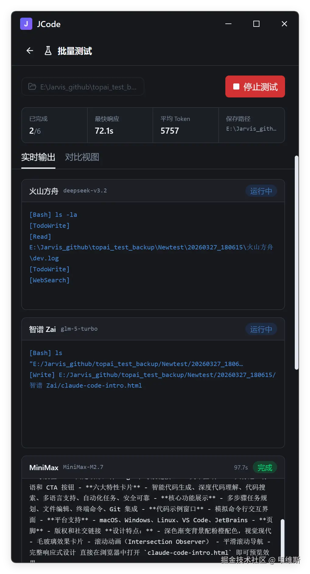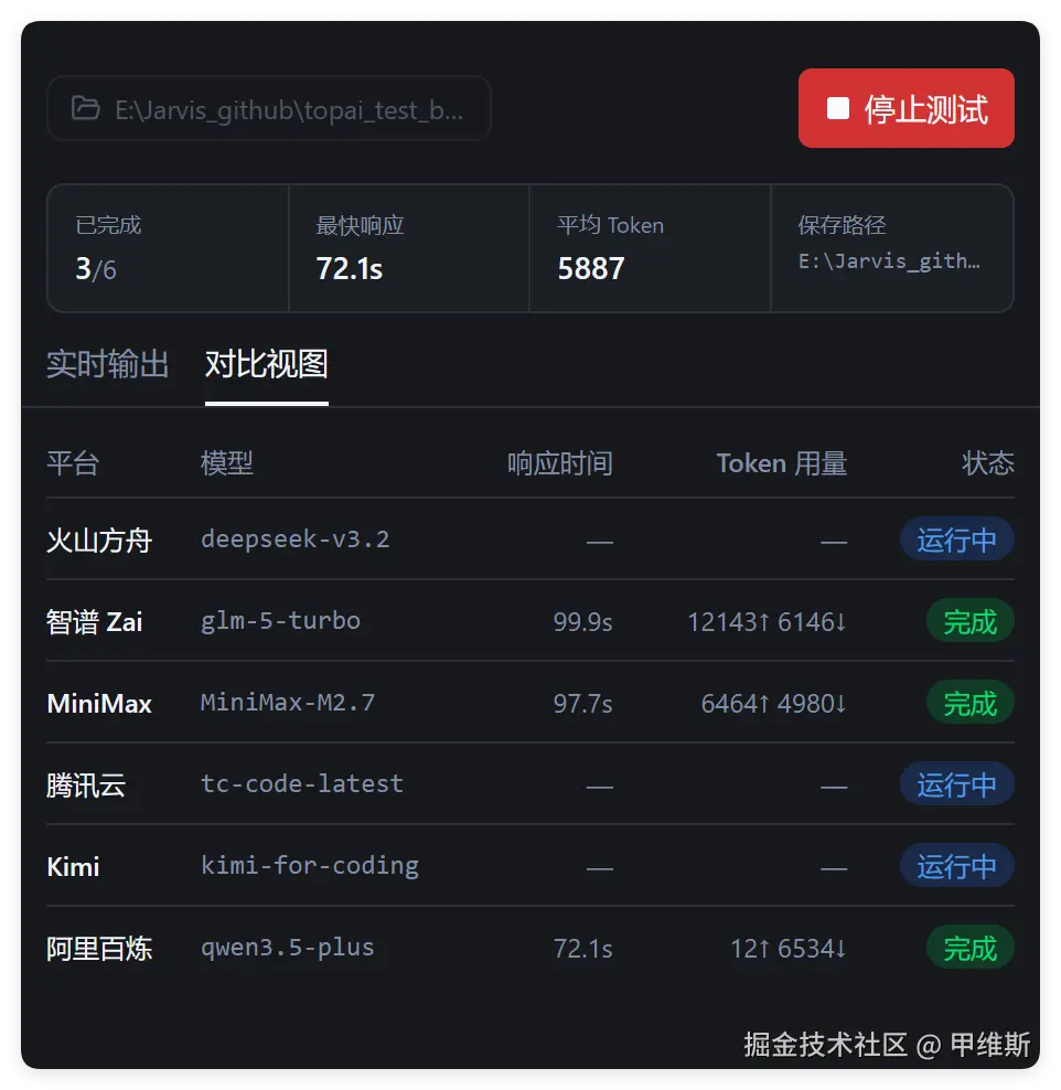 | 统计栏 | 已完成数量、最快响应时间、平均输出 Token、保存路径 |