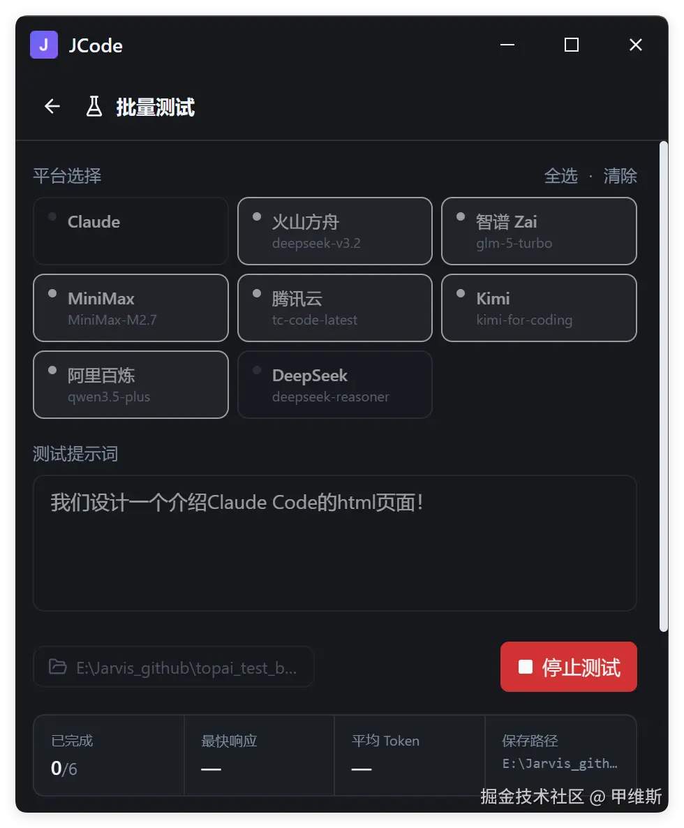 JCode 作为多平台 Claude Code 启动器,支持配置多个 AI 平台(阿里云百炼、火山方舟、MiniMax 等)。这次的文档主要介绍新增的批量测试功能。