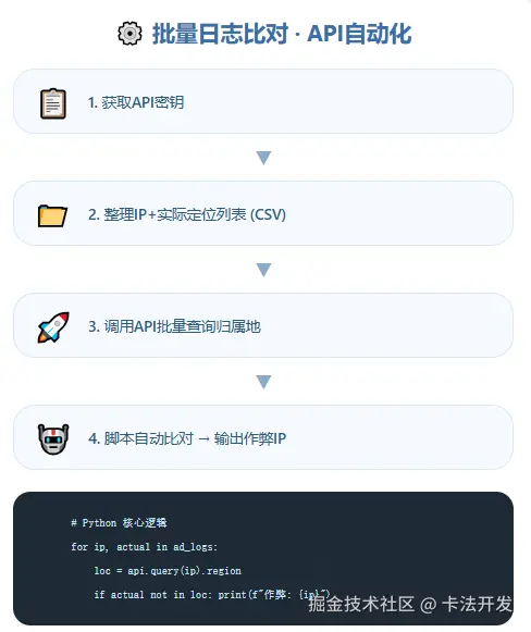 | API批量比对(IP查询工具API) | 高效自动化,支持大规模日志处理 | 广告日志批量核验、高并发场景 | 中 |