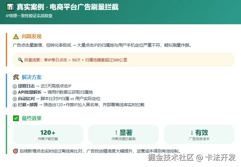 二、真实运维案例:IP地理一致性验证解决广告刷量作弊