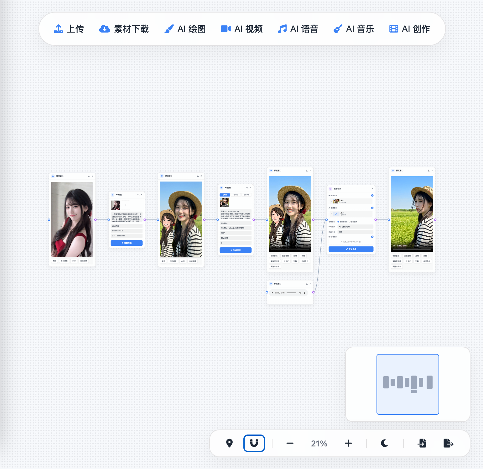 下载后点击 AI 画布,然后点击导入,选择群里分享的“动漫分身”工作流,完成!