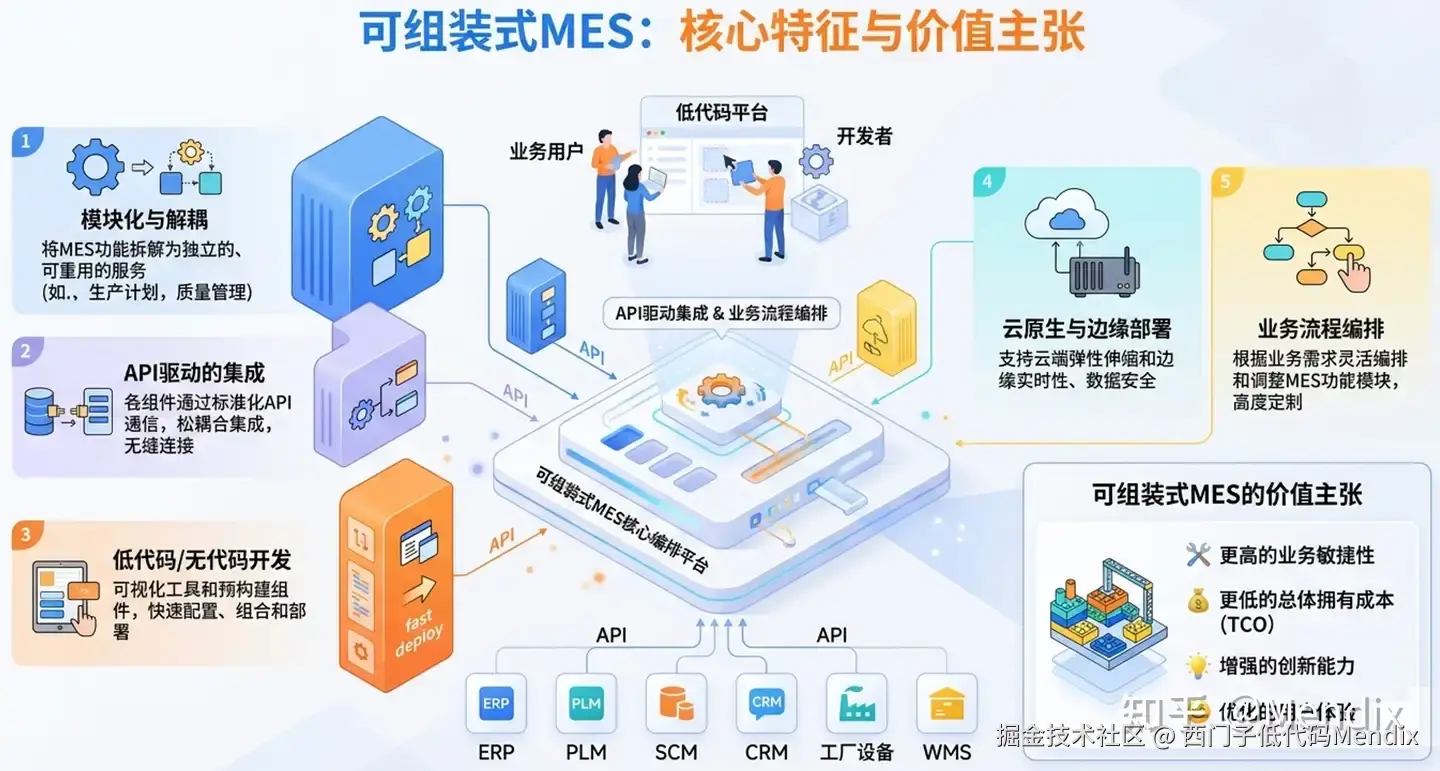 为应对这些挑战,可组装式MES(Composable MES)的概念应运而生。它借鉴了微服务架构、API经济和低代码/无代码开发理念,旨在构建一个更加灵活、模块化、可扩展的MES生态系统: