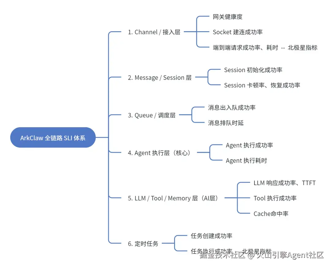 面对挑战,ArkClaw 团队没有选择在传统日志上修修补补,而是提出了一套更具前瞻性的解决方案:以服务等级指标(SLI)度量为牵引,构建一套从端点采集、链路追踪到数据治理的闭环可观测体系。 我们相信,只有先定义出衡量“好”与“坏”的标尺,后续的观测与优化才有意义。