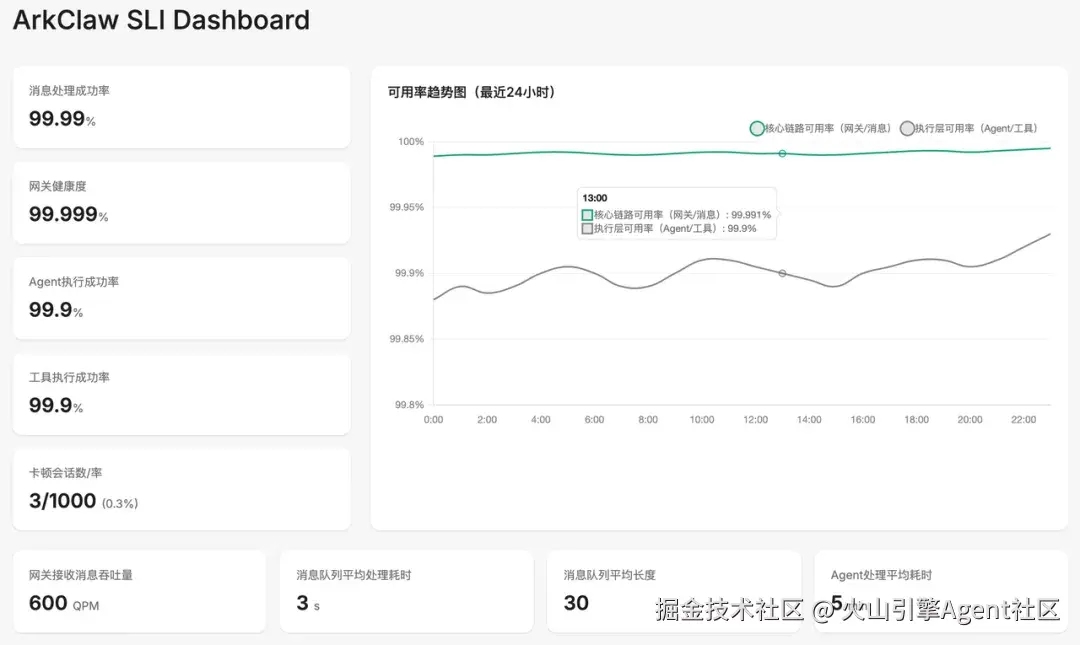 ArkClaw 进一步提供了开箱即用的 SLI 观测大盘(Dashboard) ,帮助开发者从“指标定义”走向“实时可视化与问题定位”,详细请登录控制台查看,示例如下图: