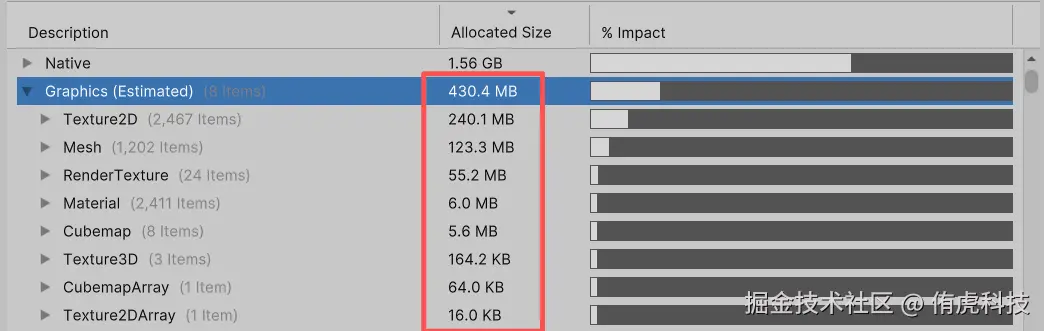 Q:我们项目中通过系统层统计到的显存有1.5GB,但是通过引擎层采集到的纹理、网格、RT这些加起来也只有400+MB,为什么会这样,其它的部分是什么呢?