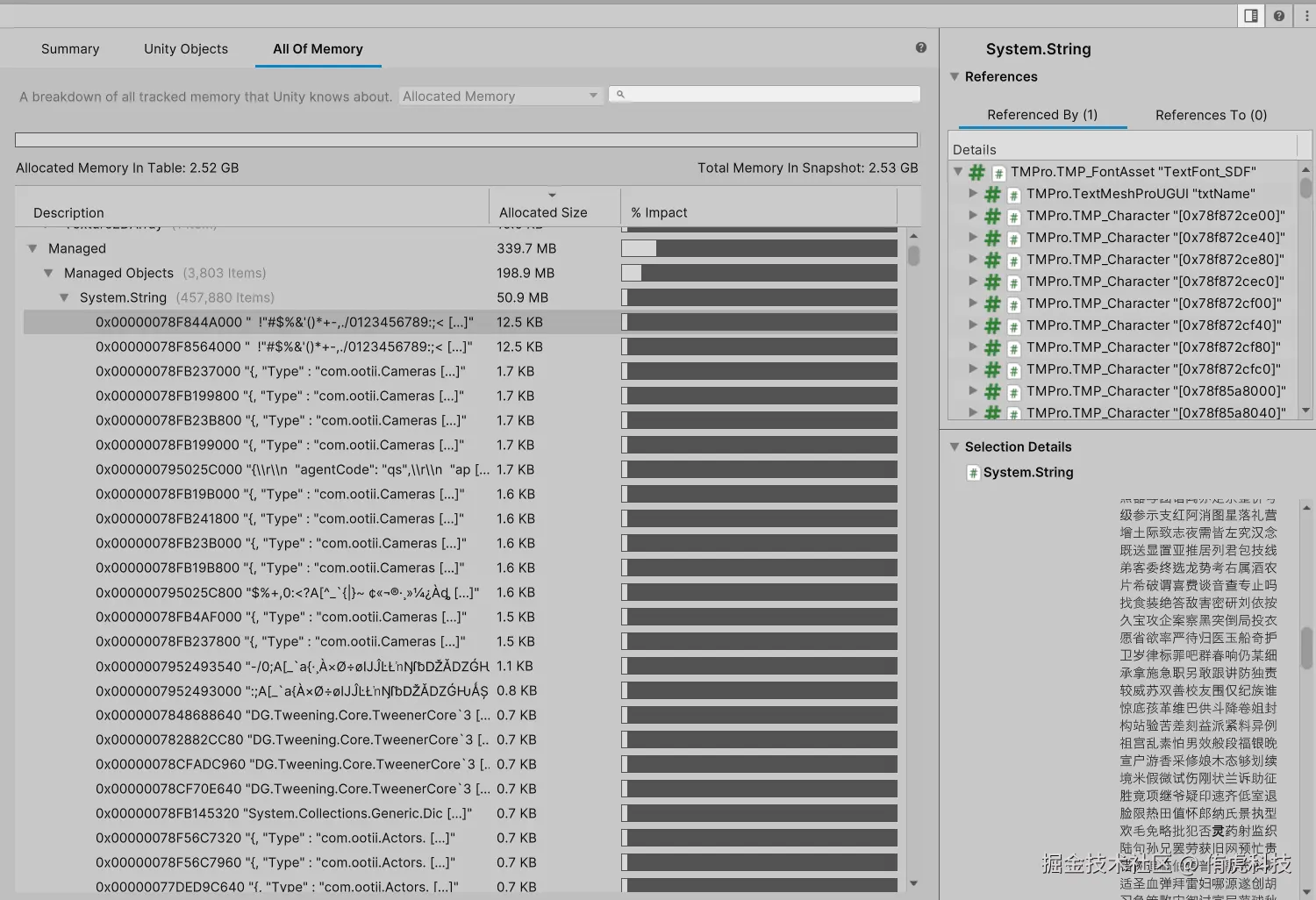 A:这一部分占用还是比较高的,从下图右边的Details信息看很多来自TMP图集用的文本,这种大量字符串理论上不应该驻留在运行时了,我们生成了TMP的图集纹理后像这个文本应该就不需要了,可以看看是不是可以及时卸载。