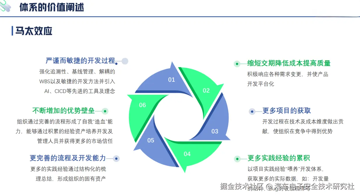 中小车企搭建轻量化 ASPICE 研发体系,并非单纯为满足标准要求,更核心的是实现研发能力的持续升级,形成马太效应。通过严谨而敏捷的开发过程,强化追溯性与基线管理,结合 AI、CICD 等先进工具,能快速响应需求变更,实现产品开发平台化,从效率、成本、质量三个维度提升研发竞争力; 以项目实践经验持续 “喂养” 研发体系,获取开发量估计、Bug 收敛规律等实际数据,持续优化体系流程; 将实践经验结构化梳理为企业固有资产,让研发流程与能力实现迭代升级;通过完善的流程形成企业自我 "造血" 能力,培养专业的研发与管理人才,获得更多市场信任,建立核心优势壁垒; 最终在技术与成本维度形成差异化竞争优势,让企业在汽车智能化浪潮中获取更多项目机会,实现研发能力与市场竞争力的双向提升