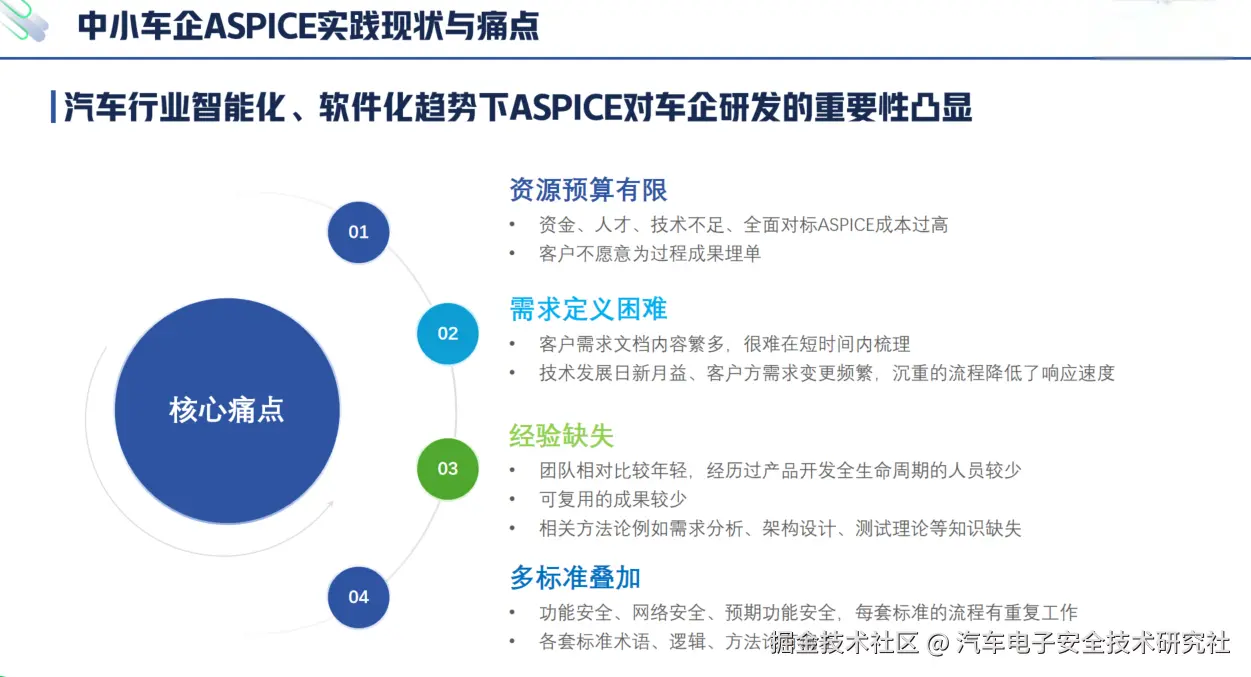 - 其四是资源预算有限,资金、人才、技术储备不足,全面对标 ASPICE 的成本过高,同时市场对研发过程成果的付费意愿低,企业难以实现成本回收