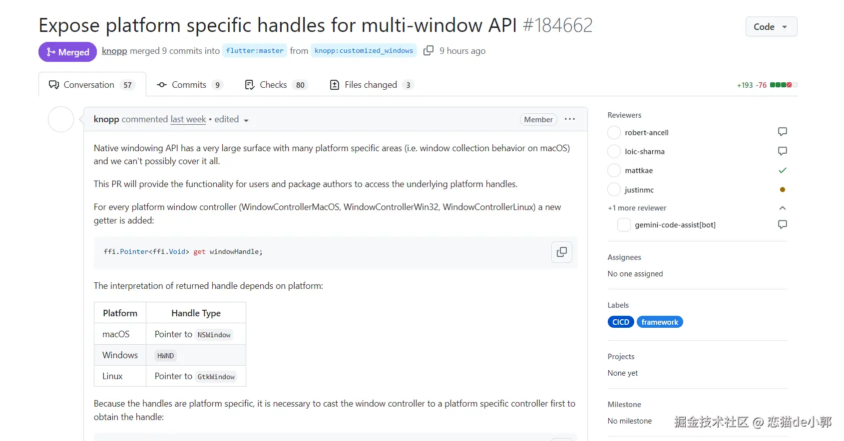 不久前 Flutter 的多窗口在 WindowController 新增了 「底层原生窗口句柄」的支持,目前 PR 已经完成了合并,也就是现在 Flutter 多窗口的灵活度和可用性有了不错的提升: