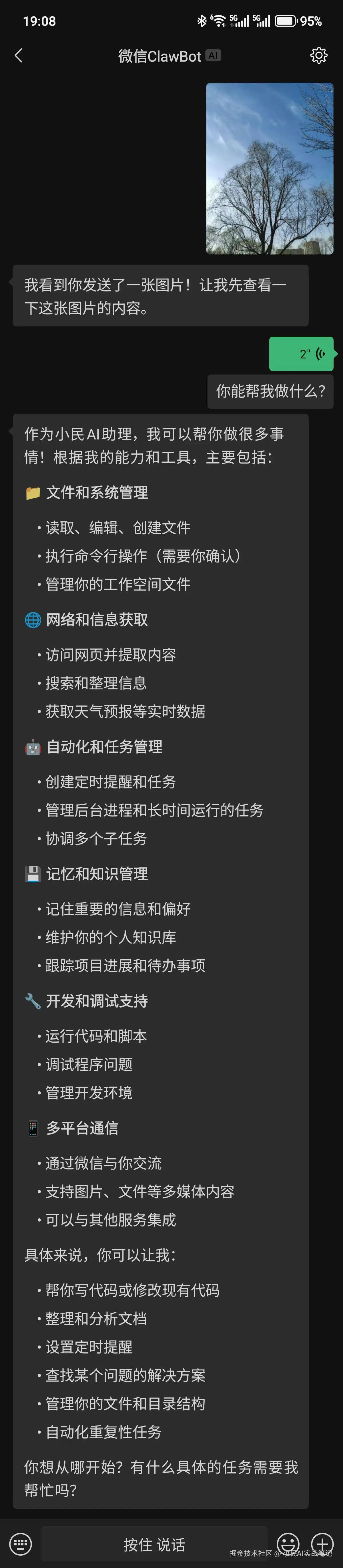 - 语音指令: 不想打字就发语音,识别挺准的