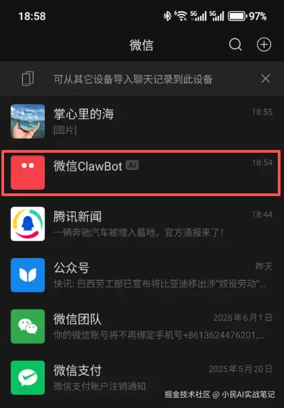 同时,微信通讯录里会出现「微信ClawBot」