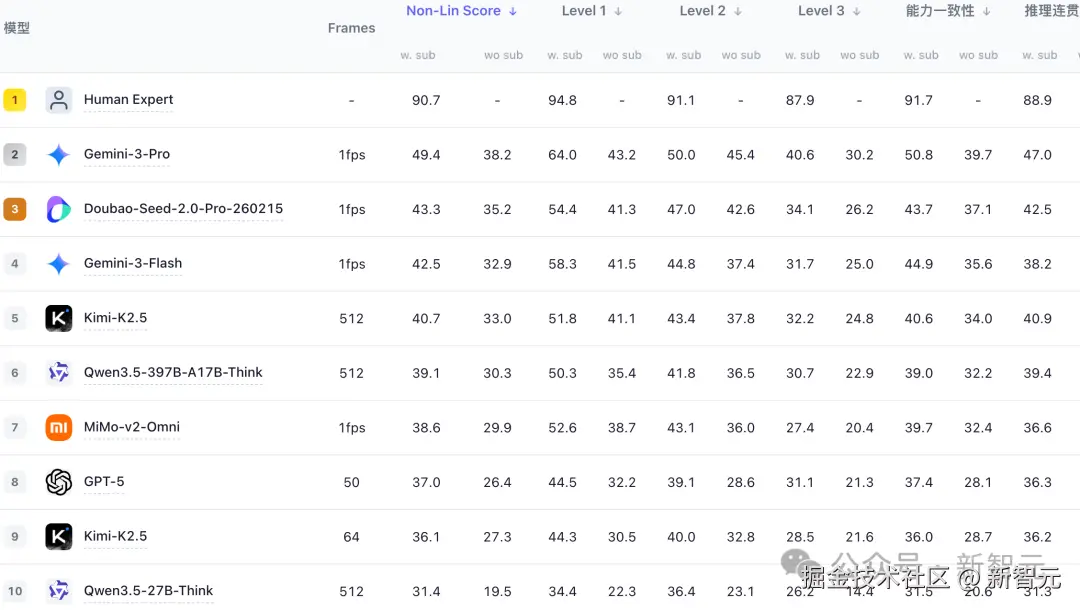 评测结果显示:人类专家的非线性得分为 90.7(传统 Acc 为 94.9),而当前最强的商业模型 Gemini-3-Pro 得分仅为 49.4,开源模型 Qwen 最佳结果为 39.1。