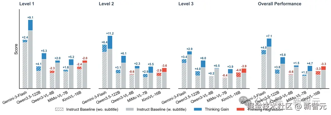 但另一方面,Thinking 也可能带来退化。Qwen3-VL-8B 在无字幕设定下出现了 -0.6 的下降,而 KimiVL-16B 在整体上出现了 -3.3/-3.3 的性能回落,在更强调复杂推理的 Level 3 上,退化甚至达到 -4.0/-3.9。