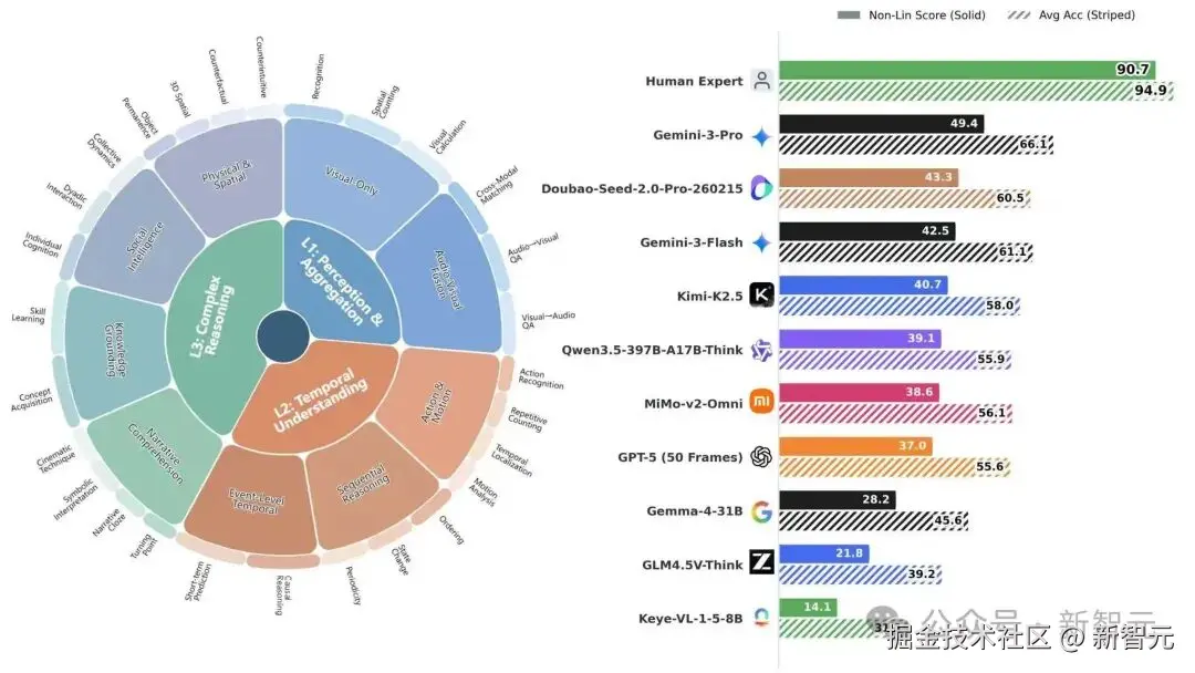 【新智元导读】现有大模型评测分数日趋饱和,但与真实体验差距显著。南京大学傅朝友团队牵头,在 Google Gemini 评测团队邀约下推出视频理解新基准 Video-MME-v2。凭借创新的分层能力体系与组级非线性评分,以及 3300 + 人工时高质量标注,揭示模型与人类的巨大鸿沟(49vs90)、传统 Acc 指标虚高、以及「Thinking」并非总是增益等现象。