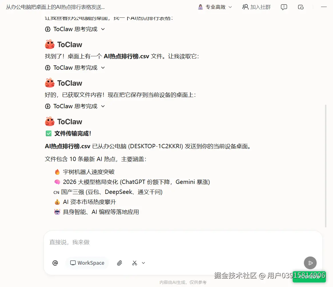 我在外面用手机,突然需要办公室电脑里一份合同。以前得远程连上去翻半天,那次我直接对着手机说了一句“找到我办公室电脑里那份XX合同”,十秒钟后,文件出现在我手机上。整个过程我连文件路径都没想过。