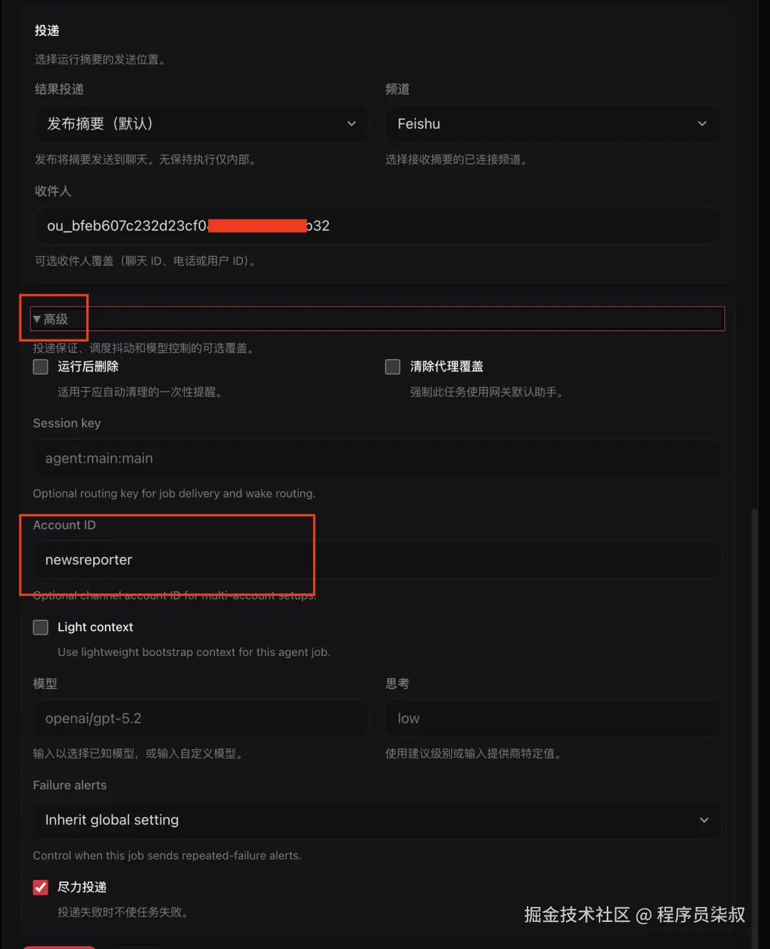 核心原因:delivery.accountId 未指定,导致系统选错了 Feishu 应用账号。