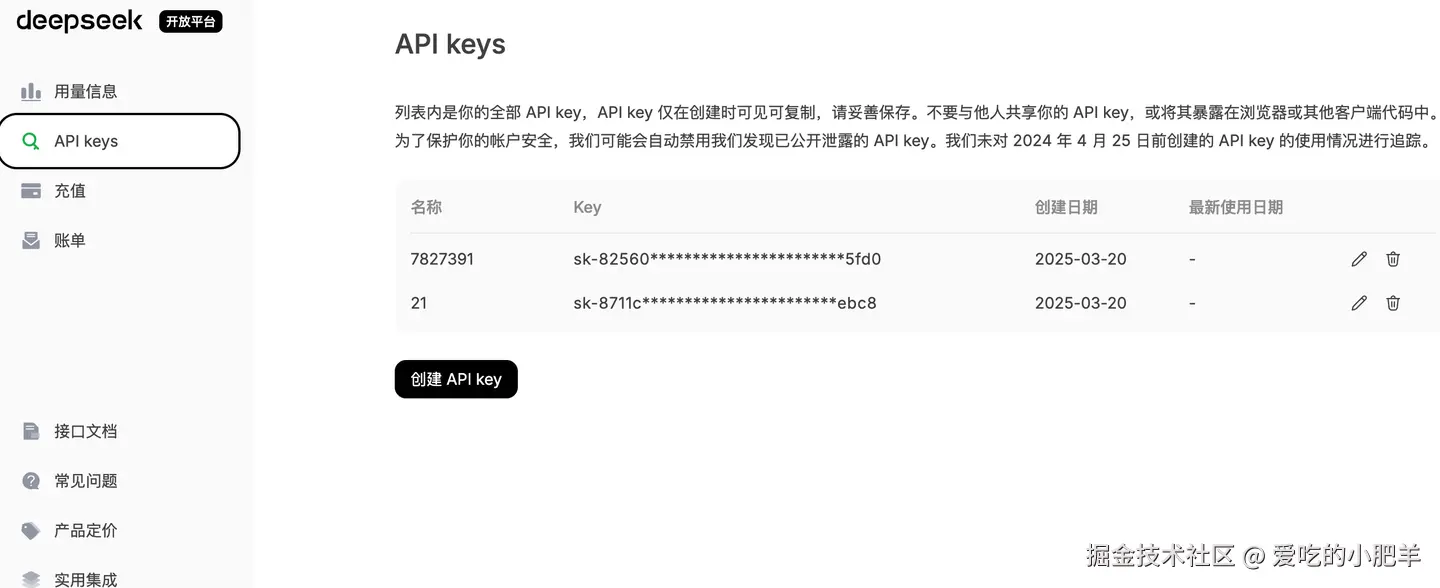 具体步骤大概是这样:登录 DeepSeek 开放平台,在 API Keys 页面新建一个密钥并复制保存。