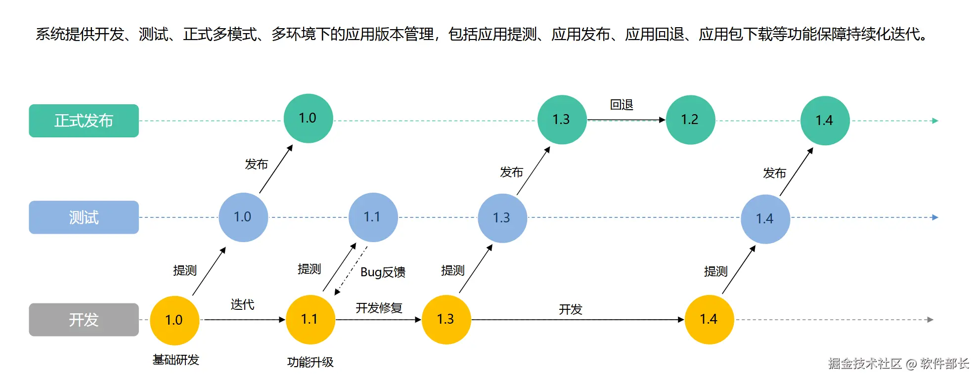 提供完整的应用生命周期管理,版本管理、环境隔离、发布审核等。独立环境中搭建应用,测试后提交发布申请,审核后上线。如现问题,可一键回滚到上一个稳定版本。