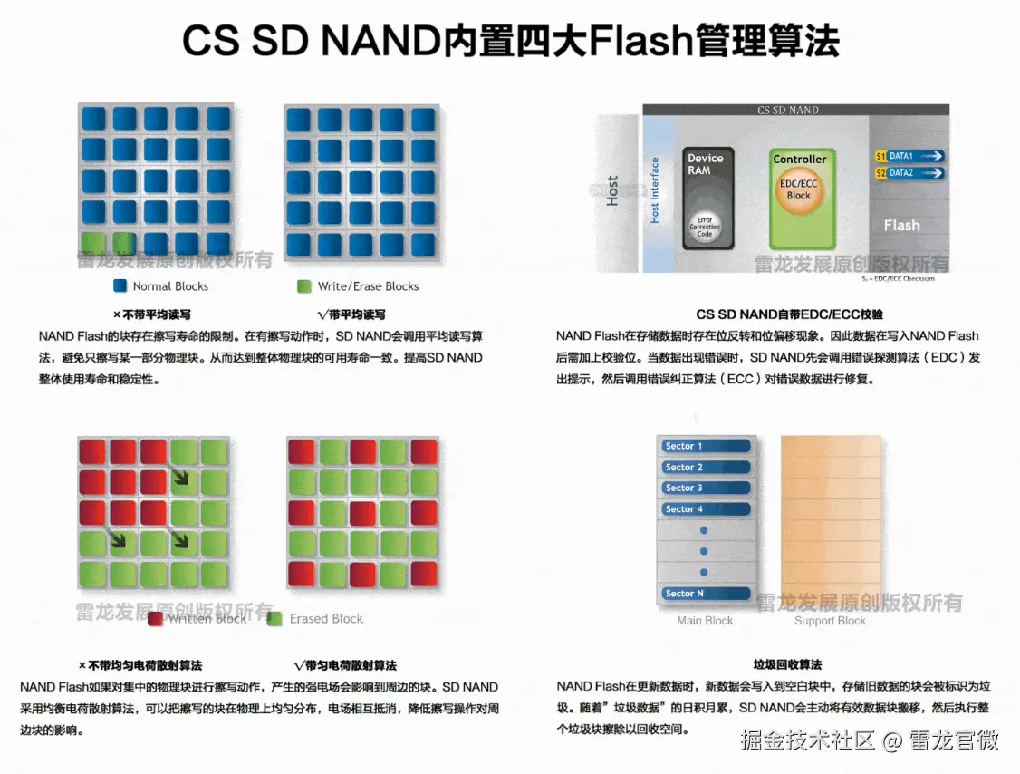 垃圾回收算法:NAND Flash在更新数据时,新数据会写入到空白块中,存储旧数据的块会被标识为垃圾。随着”垃圾数据"的日积月累,CSNP4GCR01-BPW会主动将有效数据块搬移,然后执行整个垃圾块擦除以回收空间。