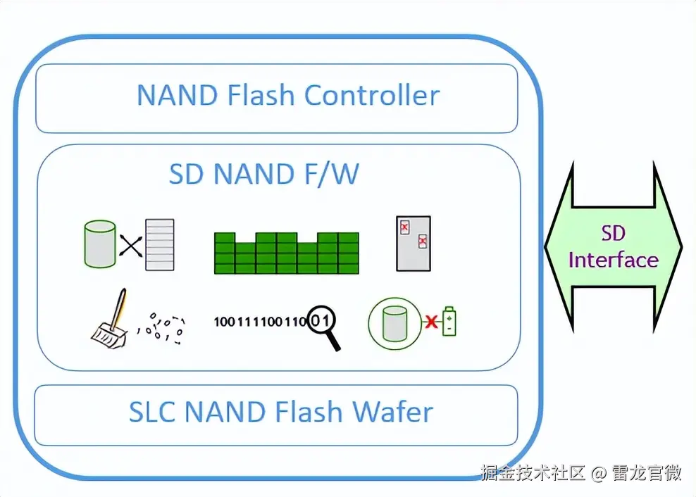 CSNP4GCR01-BPW的架构,简单来说内部采用使用寿命最长、性能最稳定的NAND Flash(SLC NAND Flash)晶圆,它的擦写寿命可以达到5~10万次。内置了Flash控制器和针对NAND Flash管理的Firmware。对外采用通用性最强的SD接口(几乎MCU都带有SD接口)。