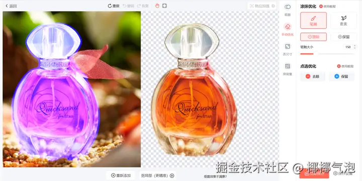 - 基础边缘优化——对常规人像、产品、动物的主体识别干净利落,满足日常自媒体需求。
