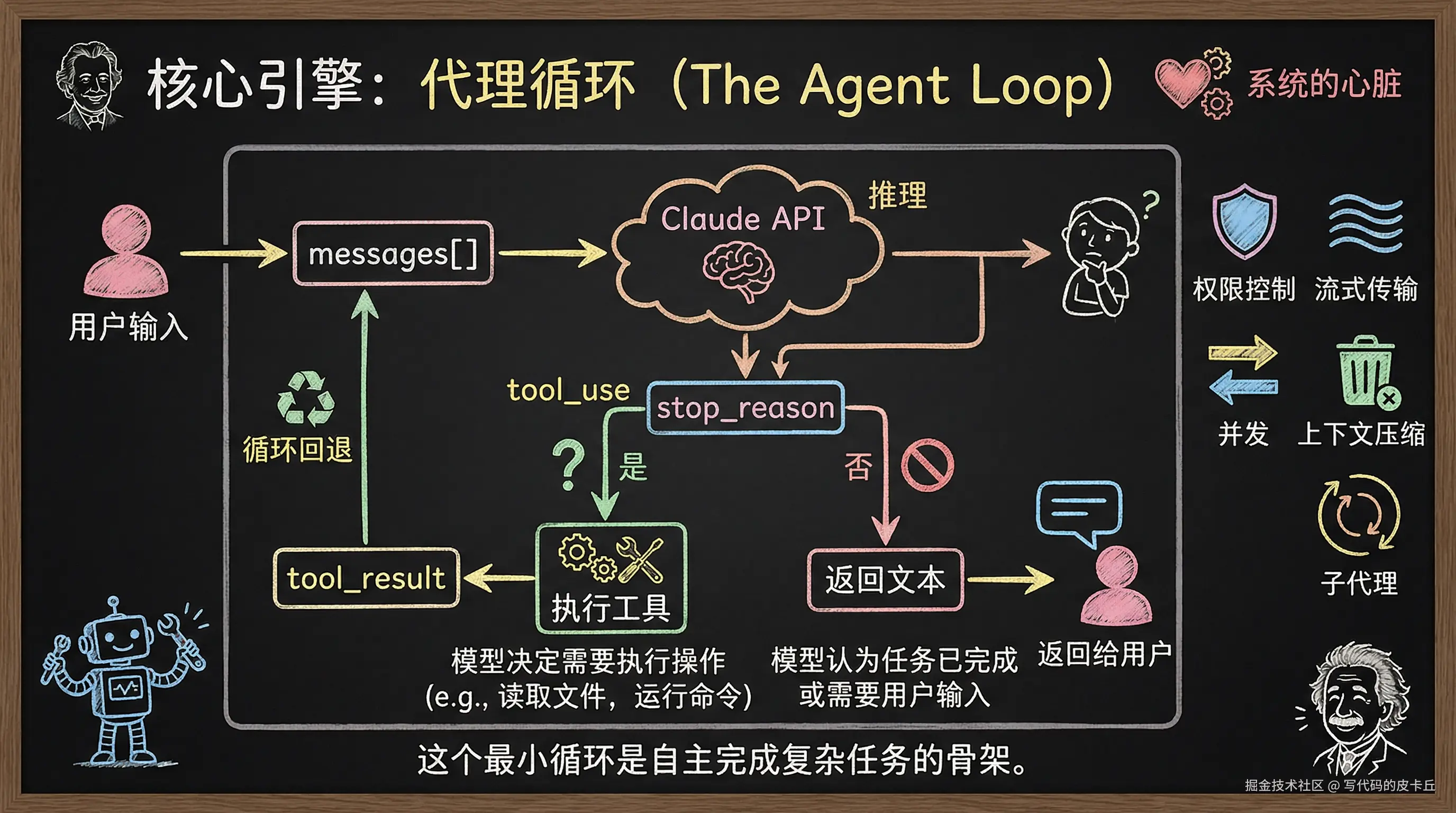 tool_use) :模型决定需要执行一个操作(如读取文件、运行命令)。系统会执行工具,将结果封装为tool_result并追加到messages[]中,然后循环回退,带着新信息再次请求API。 - 文本响应:模型认为任务已完成或需要用户输入,则直接将文本结果返回给用户。