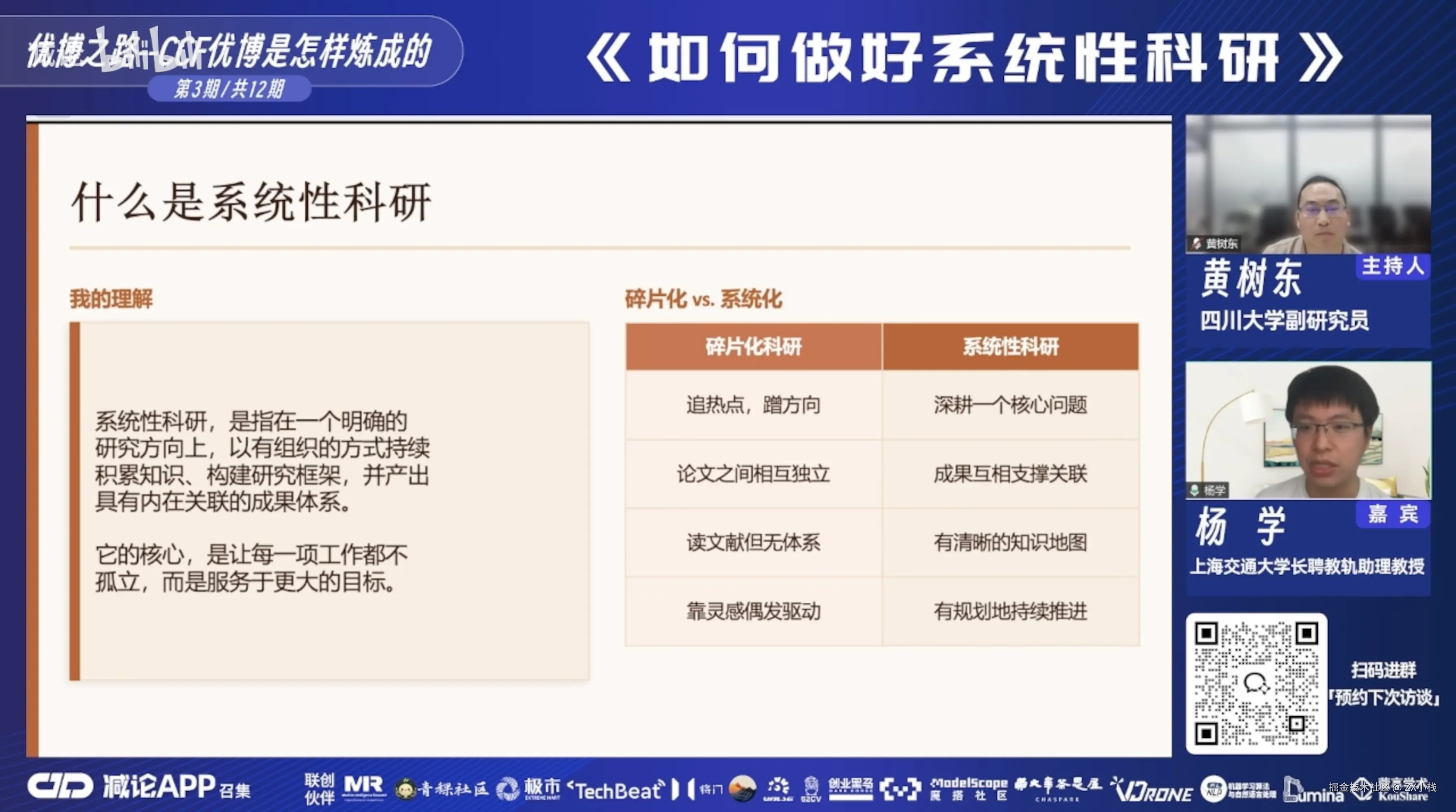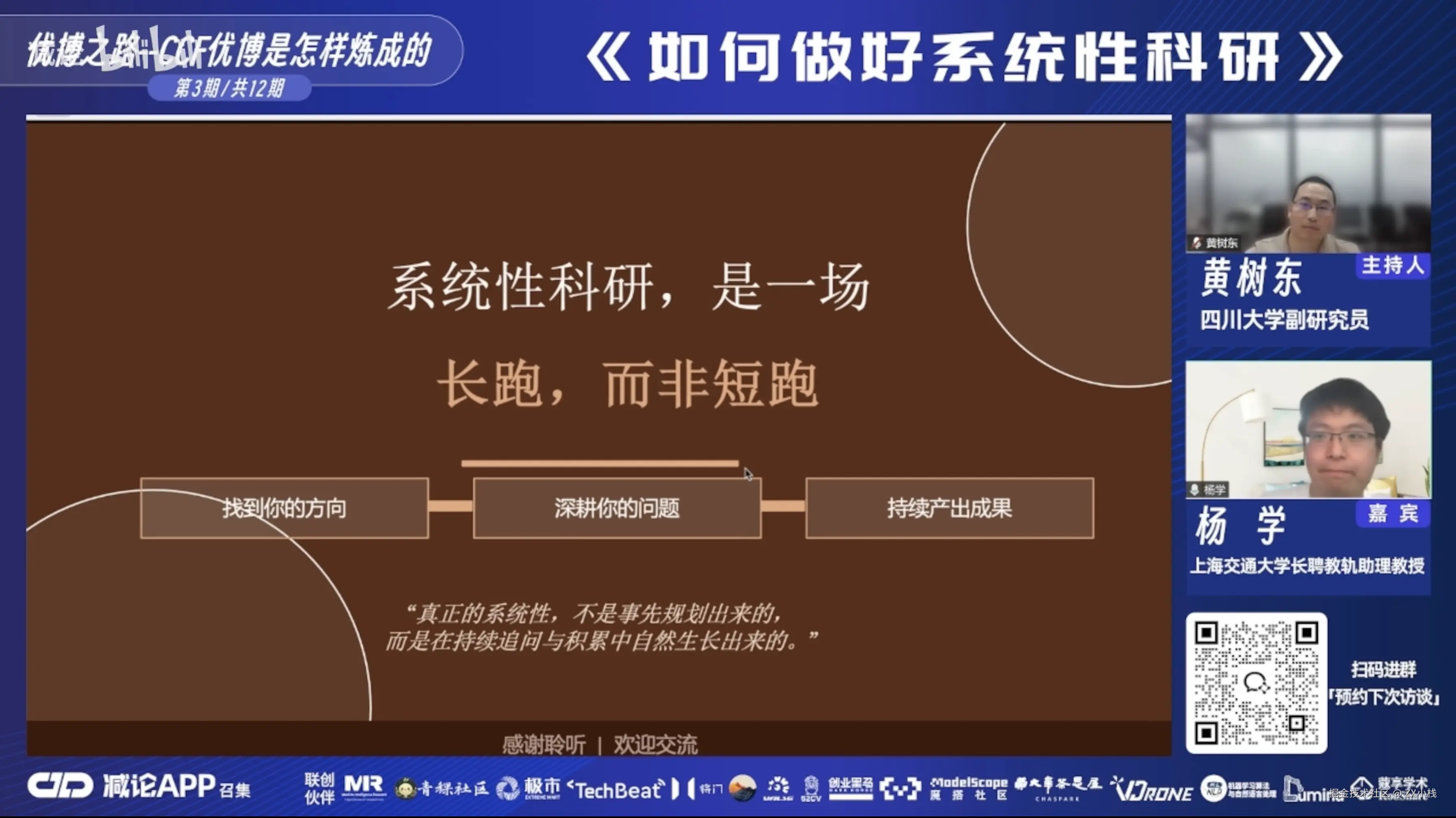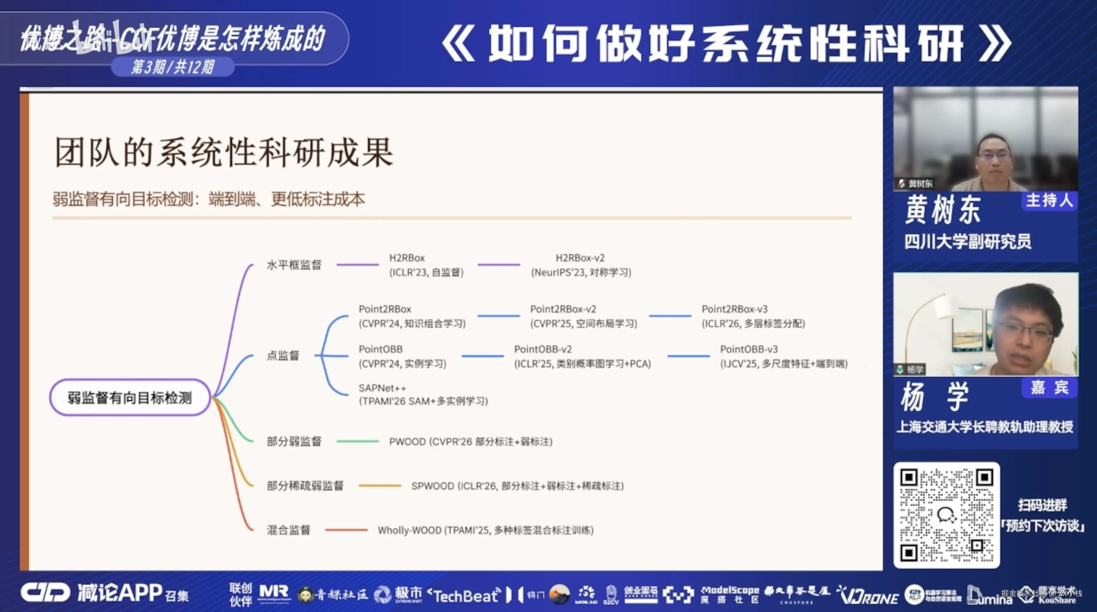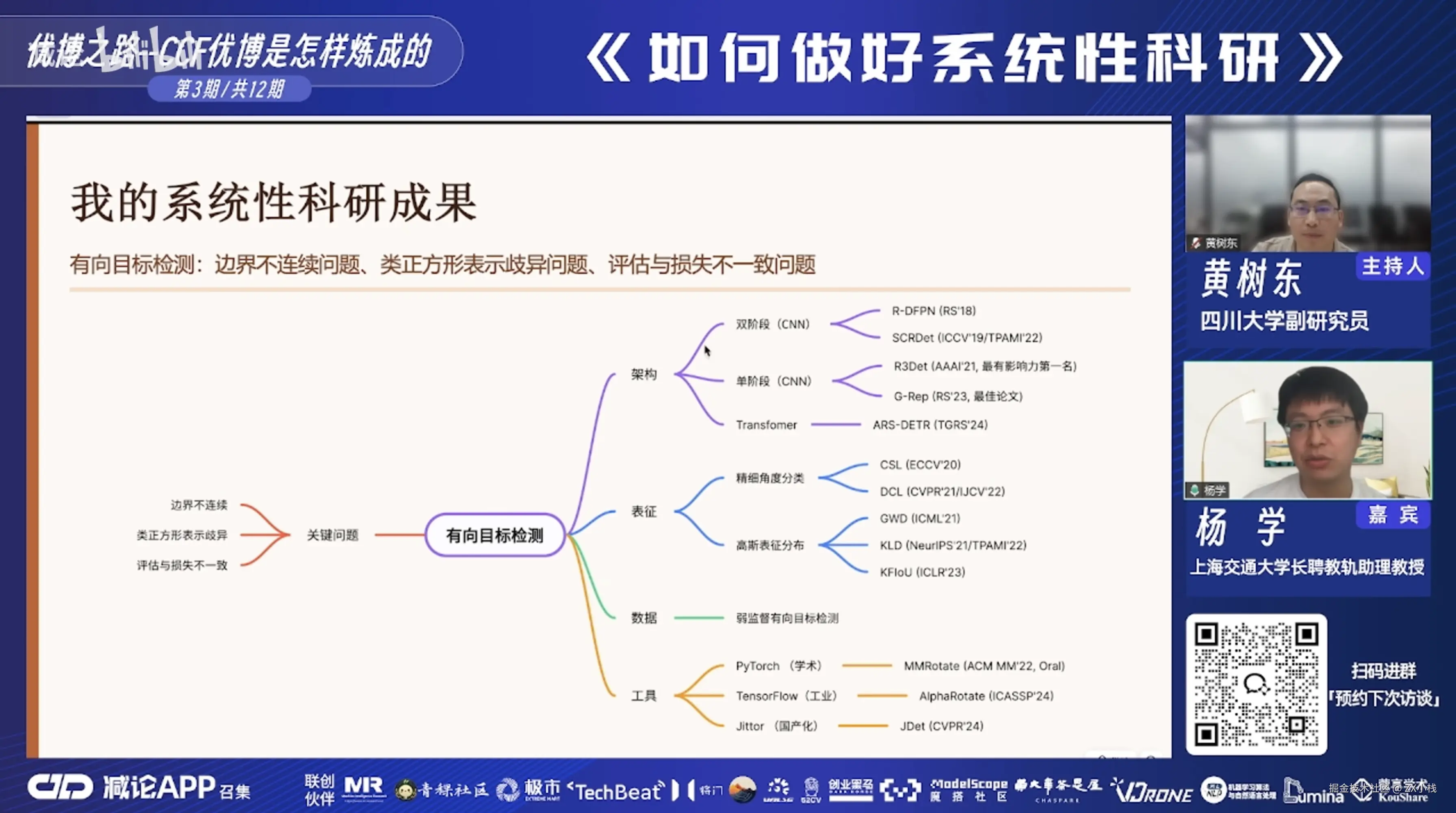 这两个事情不是完全对立的。我在做系统性科研的同时,也需要去了解热点在做什么。比如 Transformer 爆火的时候,我就去想——这个东西能不能和我做的有向目标检测做一个有机的结合?如果可以,既蹭了热点,又没脱离系统性。