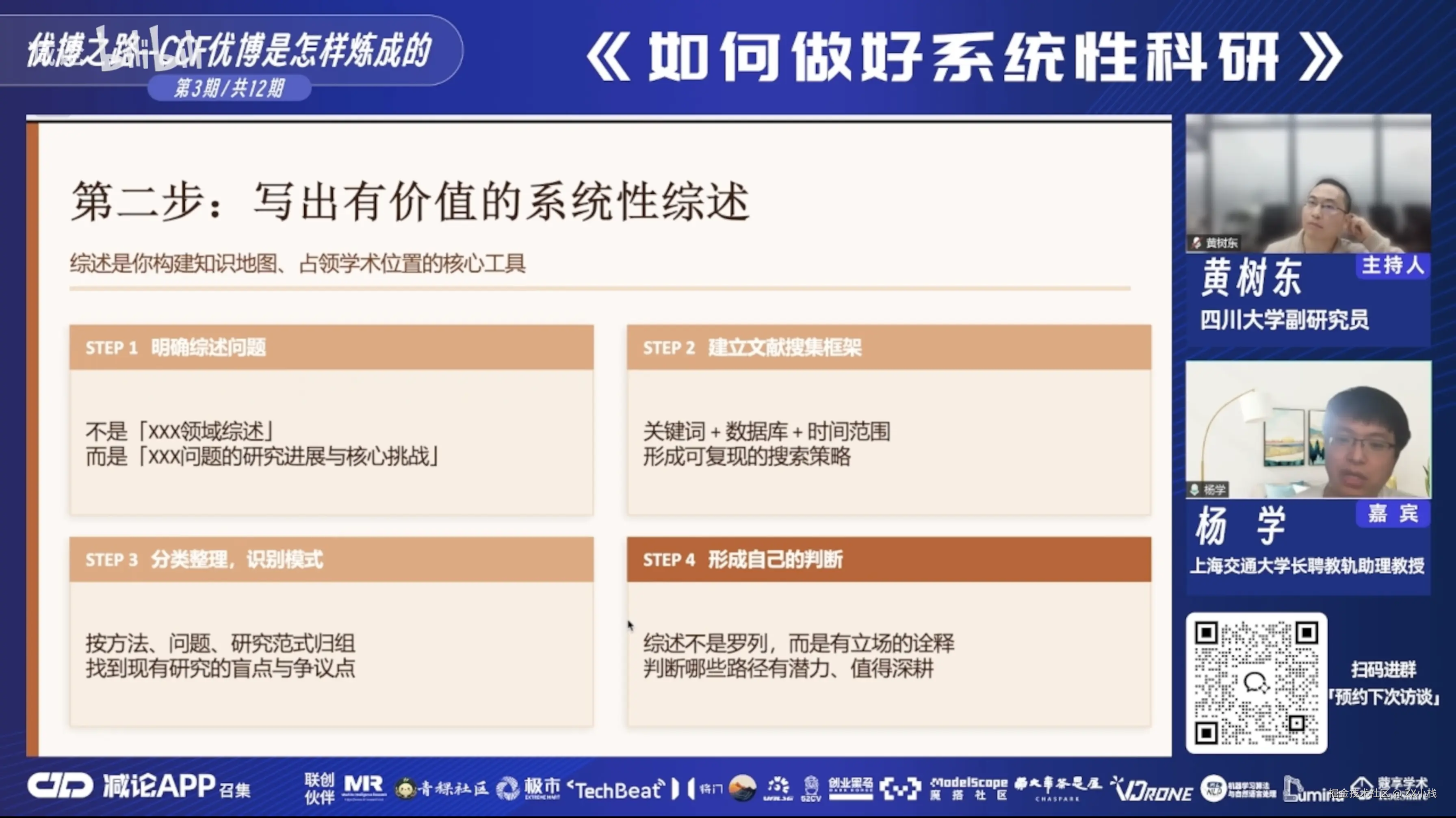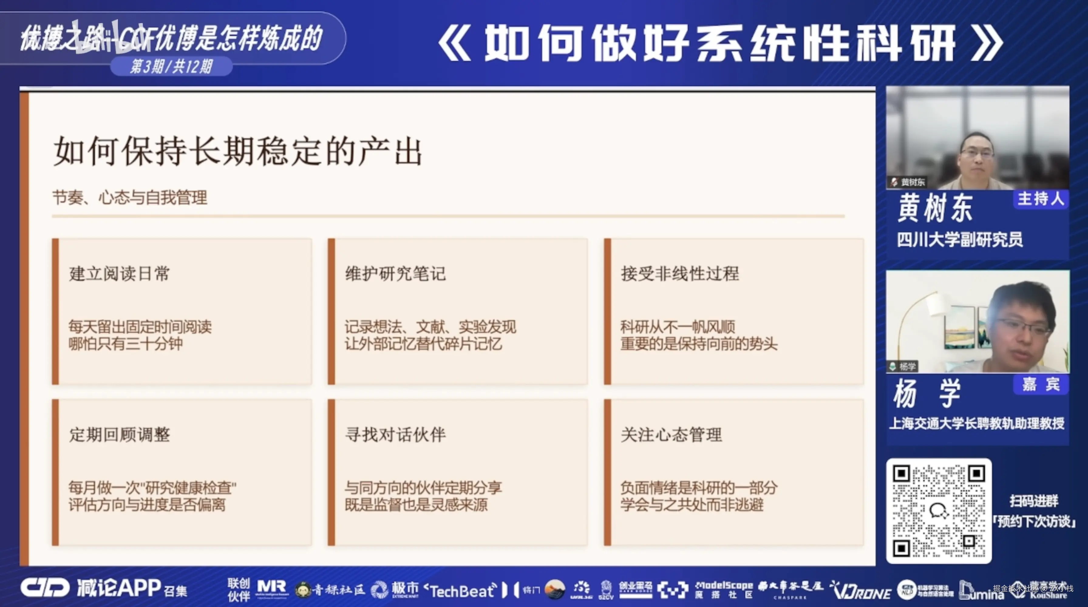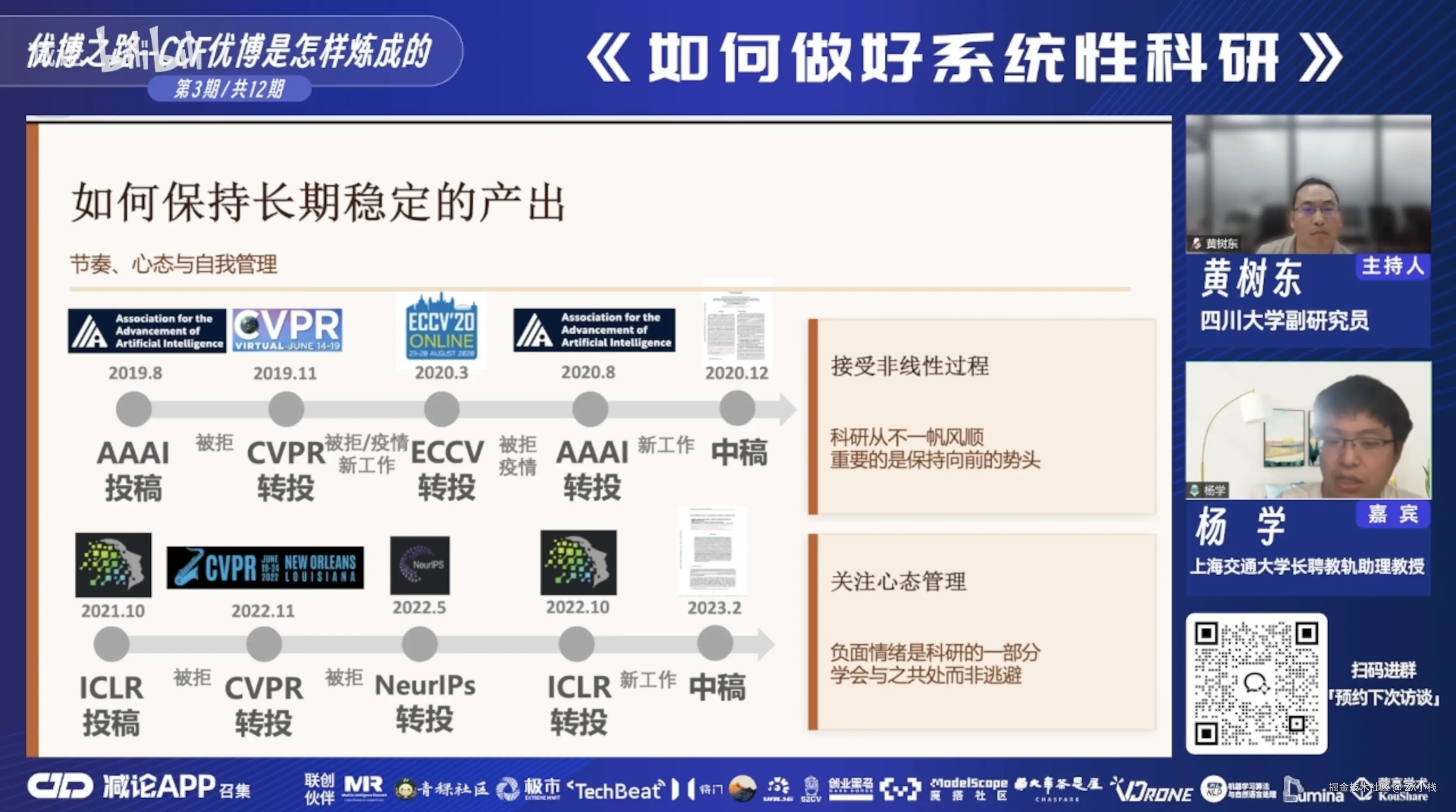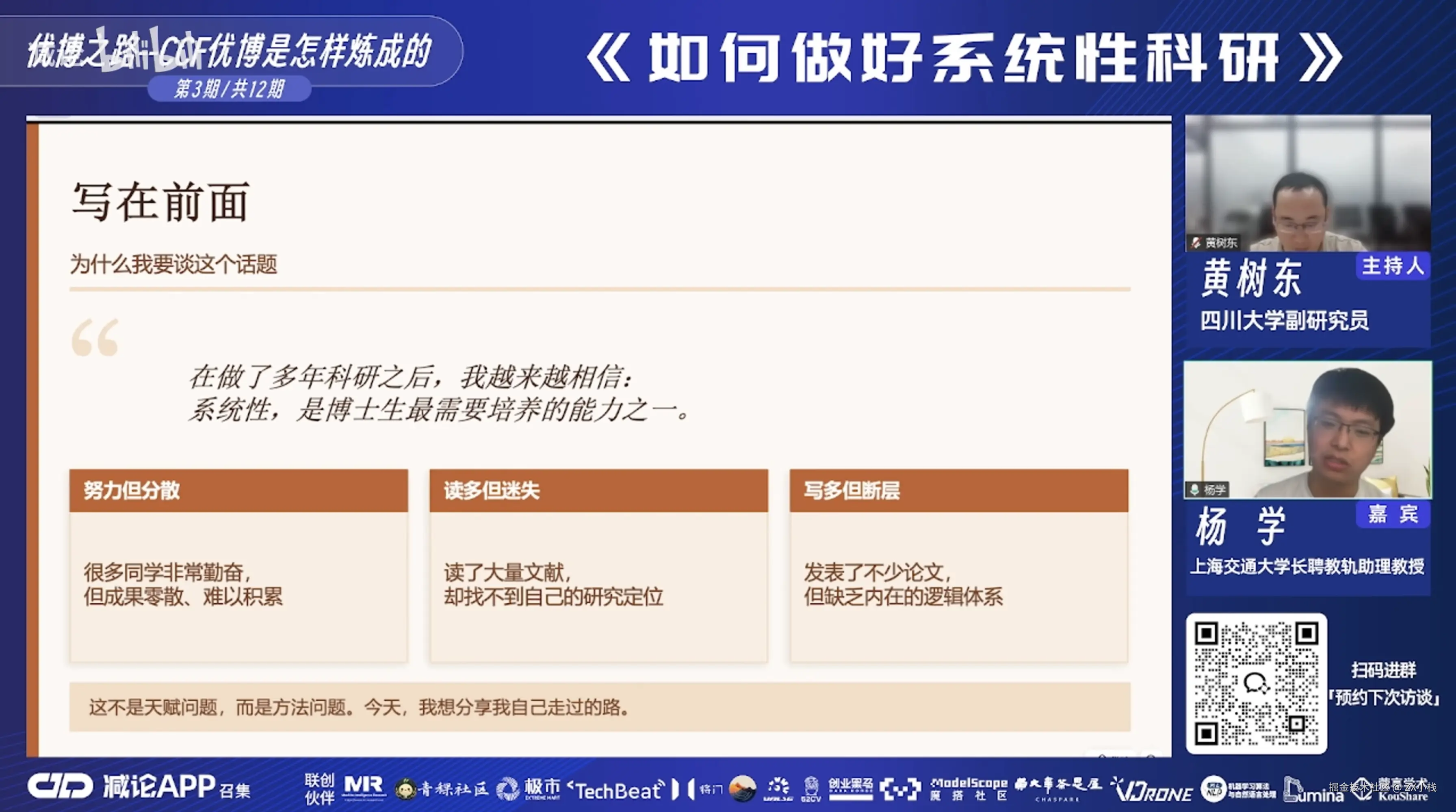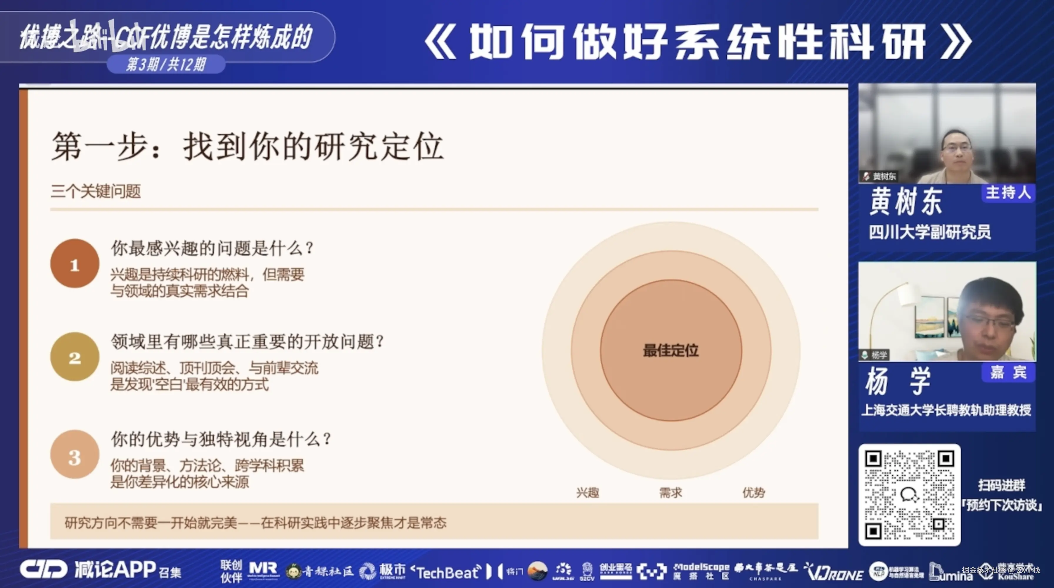 这两个事情不是完全对立的。我在做系统性科研的同时,也需要去了解热点在做什么。比如 Transformer 爆火的时候,我就去想——这个东西能不能和我做的有向目标检测做一个有机的结合?如果可以,既蹭了热点,又没脱离系统性。