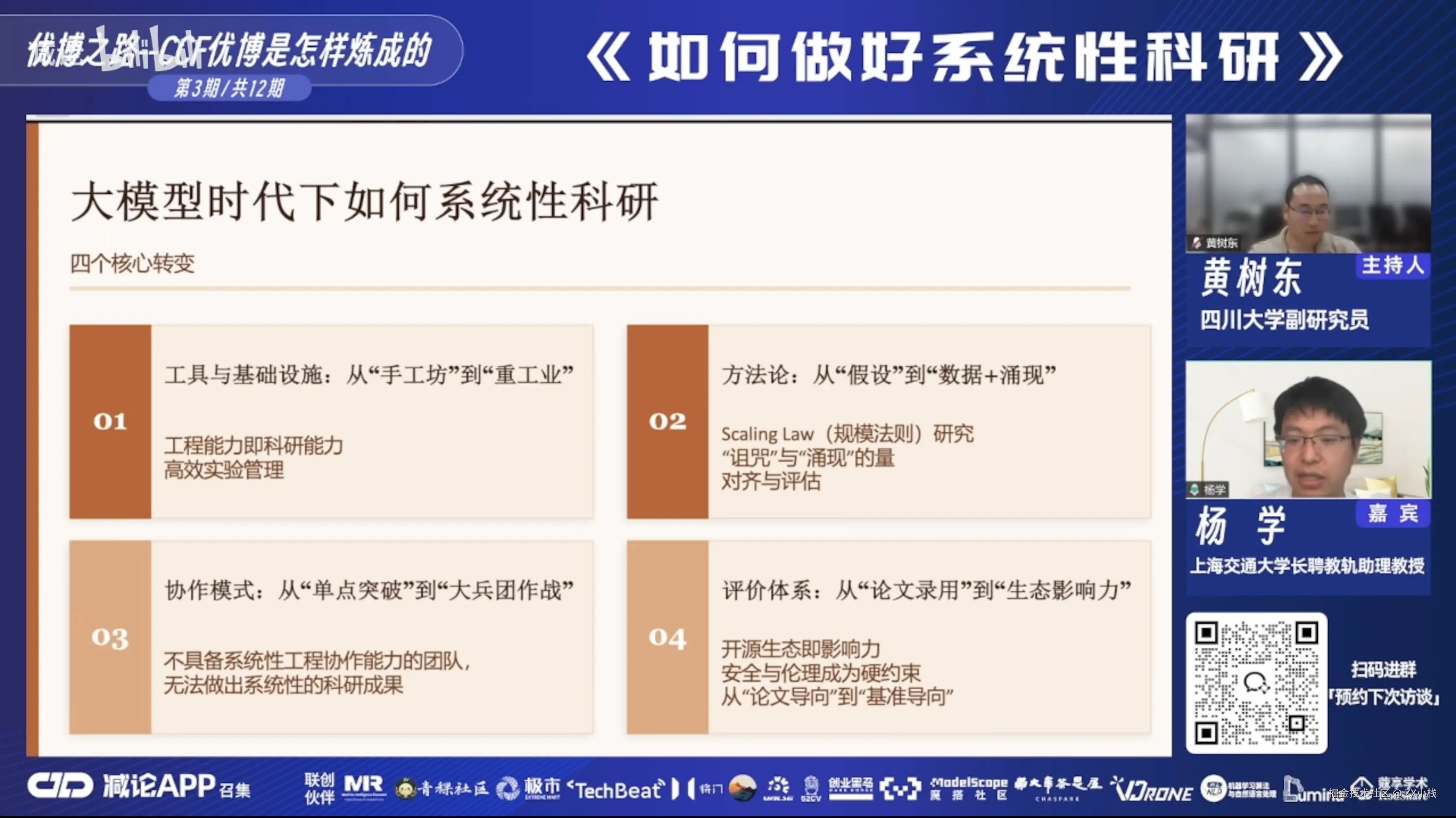 到了大模型时代,大兵团作战本身就把这两个事情统一了——你做的就是热点,而且人多了,自然会形成系统性。每一个人参与进每个课题,课题之间就会产生关联。
