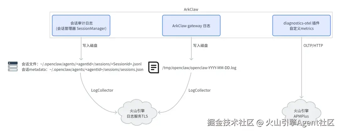 - 网关日志:网关日志不仅涵盖了网关运行日志,还包含插件子系统 (比如 channels/feishu)、cron 定时任务以及 exec 脚本执行的日志,有助于我们迅速定位因配置错误、插件配置错误致使 ArkClaw Gateway 启动失败、异常重启的根本原因,明晰定时任务和脚本执行失败的缘由;同时通过网关日志可以发现因模型限流、回退链路等模型调用异常事件。