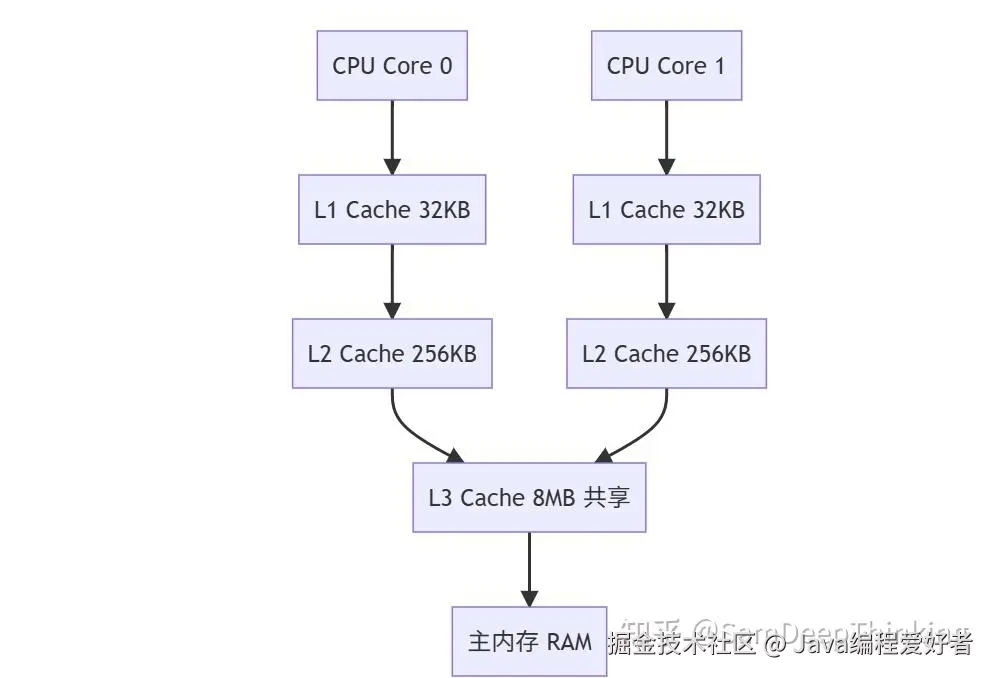 在理解 volatile 之前,必须先了解现代 CPU 的缓存架构。以 Intel i9 处理器为例: