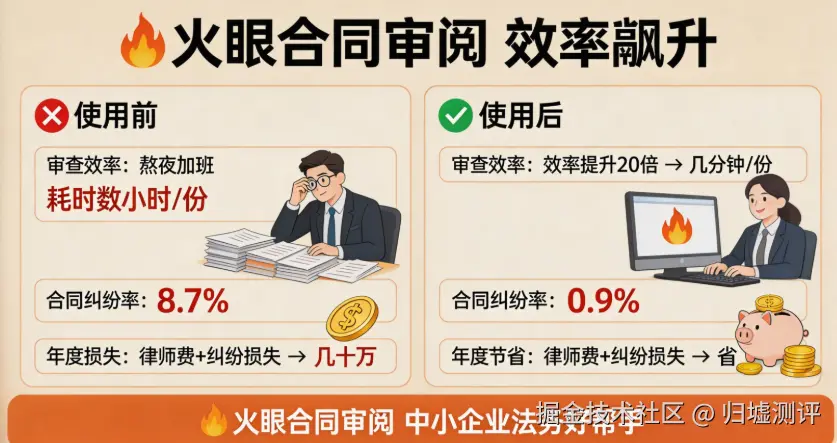 还有很多中小企业法务反馈,用火眼审阅后,合同审查效率提升了 20 倍,之前要熬夜审的合同,现在几分钟就能搞定,合同纠纷率从 8.7% 降到了 0.9%,一年下来光律师费、纠纷损失就省了几十万。