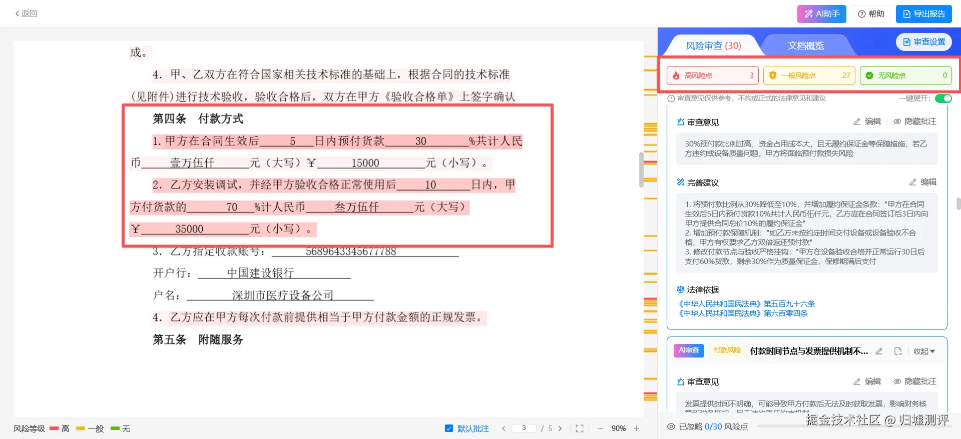我们实测过,一份 28 页的生产设备采购合同,资深法务人工审查 4 小时,还漏了 2 个中风险点;而火眼审阅 3 分钟就完成了全量审查,不仅揪出了法务漏看的 “验收标准未明确国标编号”“质保金返还逾期责任缺失”,还识别出了 “签约代表授权范围不明确” 的高风险点,整整 17 个风险点,每一个都附带「审查意见 +可直接参考的完善建议+ 法律依据」,哪怕你完全不懂法律,也知道哪里有问题、该怎么改。