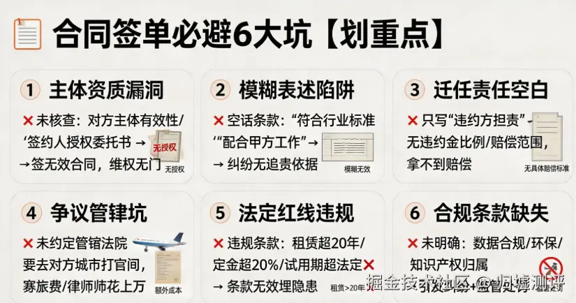 先给大家划重点,不管你签的是租房合同、劳动合同,还是供货合同、加盟协议,只要漏了这几点,大概率要踩坑: