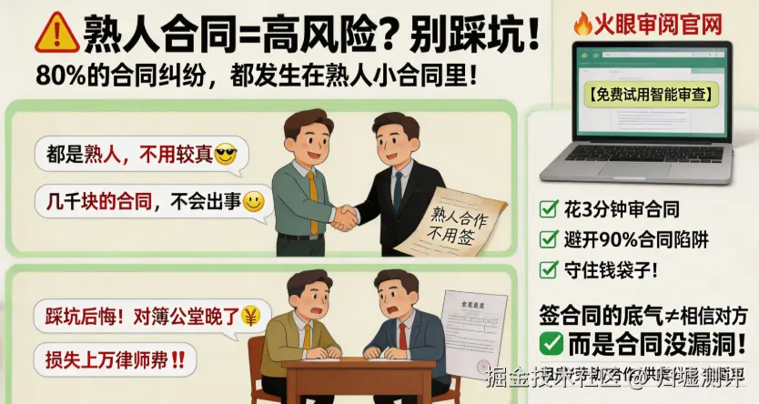 很多人总觉得,“都是熟人合作,不用那么较真”“就几千块的合同,不会出问题”,但现实是,绝大多数合同纠纷,都发生在熟人之间、看似不起眼的小合同里。等真的踩了坑、对簿公堂,再后悔当初没好好审合同,早就晚了。