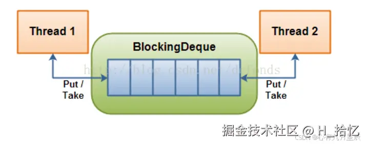 LinkedBlockingDeque 是一个双端队列,在它为空的时候,一个试图从中抽取数据的线程将会阻塞,无论该线程是试图从哪一端抽取数据。