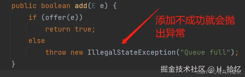 抛异常: 如果试图的操作无法立即执行,抛一个异常。源码如下.(只是以某一个队列为例子,理解意思就好,后面会整理一下各个队列的源码)