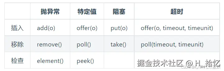 BlockingQueue 具有 4 组不同的方法用于插入、移除以及对队列中的元素进行检查。如果请求的操作不能得到立即执行的话,每个方法的表现也不同。
