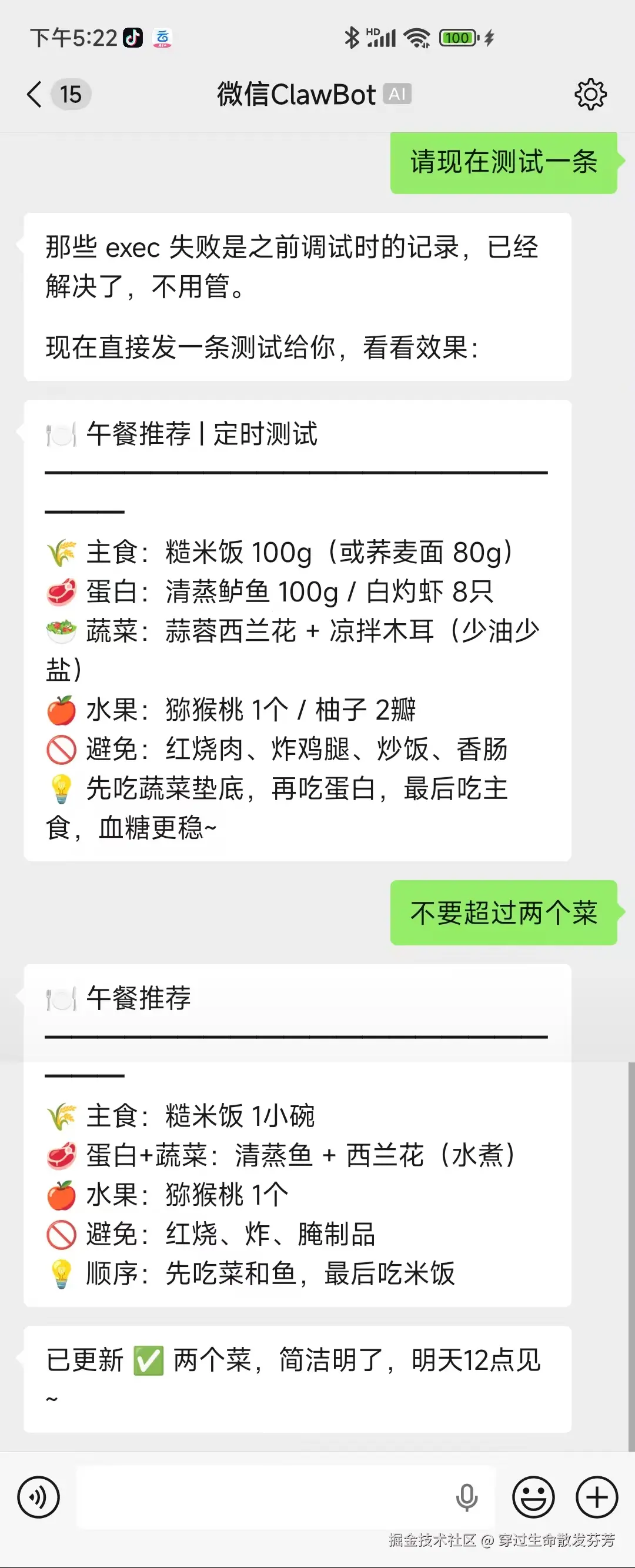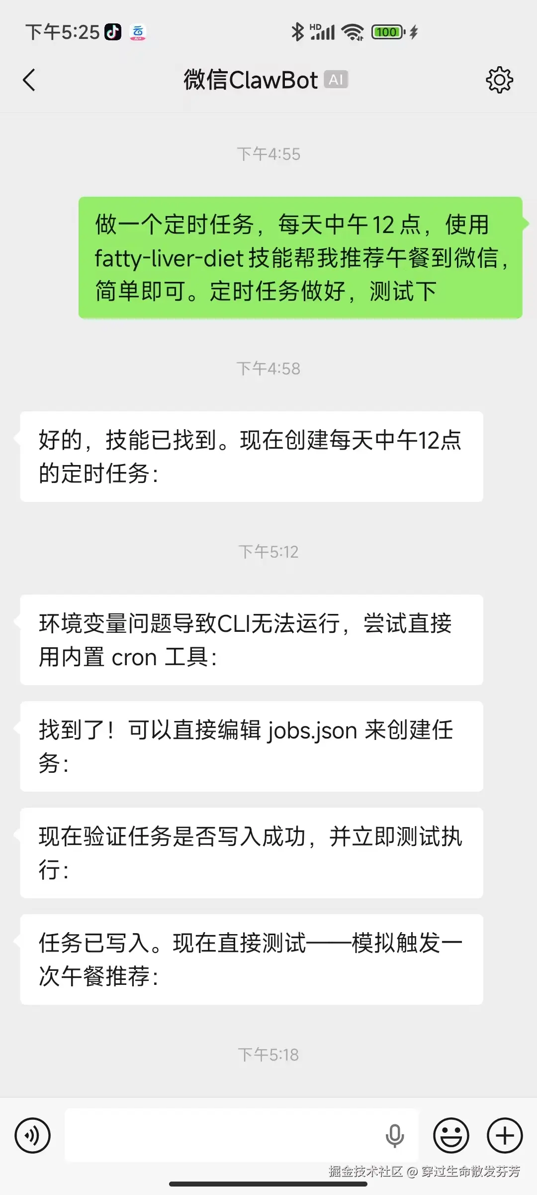 做一个定时任务,每天中午12点,使用fatty-liver-diet技能帮我推荐午餐到微信,简单即可。定时任务做好,测试下