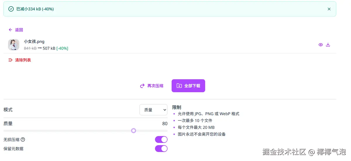 步骤3:自动压缩 上传后系统自动处理,显示压缩率(如"减少了72%")。页面会列出每张图的原大小和压缩后大小。