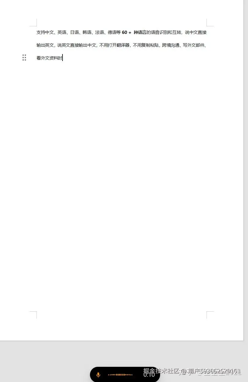 支持中文、英语、日语、韩语、法语、德语等60 + 种语言的语音识别和互转,说中文直接输出英文,说英文直接输出中文,不用打开翻译器,不用复制粘贴,跨境沟通、写外文邮件、看外文资料时,想法瞬间跨越语言,再也不用被翻译耽误效率。