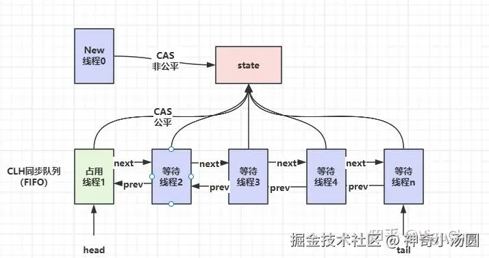 获取锁的核心逻辑依赖于对state字段的 CAS(Compare-And-Swap)操作,通过这一原子性操作实现无锁化的线程竞争与状态更新,从而避免传统锁机制带来的阻塞开销。